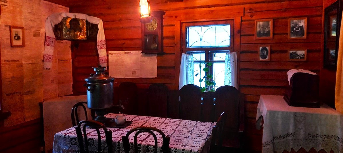 Исторический дом не сохранился, а тот что мы смотрели, воссоздан в соответствии с воспоминаниями брата поэта. Дом находится не в деревне, а на хуторе. Вокруг леса. Домик маленький, всего 6 на 6 метров. В нём жили родители поэта, его дедушка и бабушка и 7 детей. Интересно было услышать рассказ о семье Твардовских. Я, конечно, проходила в школе Василия Тёркина, но о самом поэте узнала только на этой экскурсии.