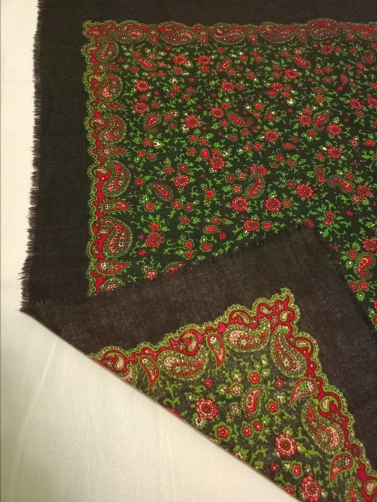 Сейчас покажу платок определённо шерстяной, тонкая шерсть. Я его купила специально, чтобы показать здесь. Потому, что такого рисунка ещё не было. Размер 92 на 94 см. Интуитивно, 1960-е.