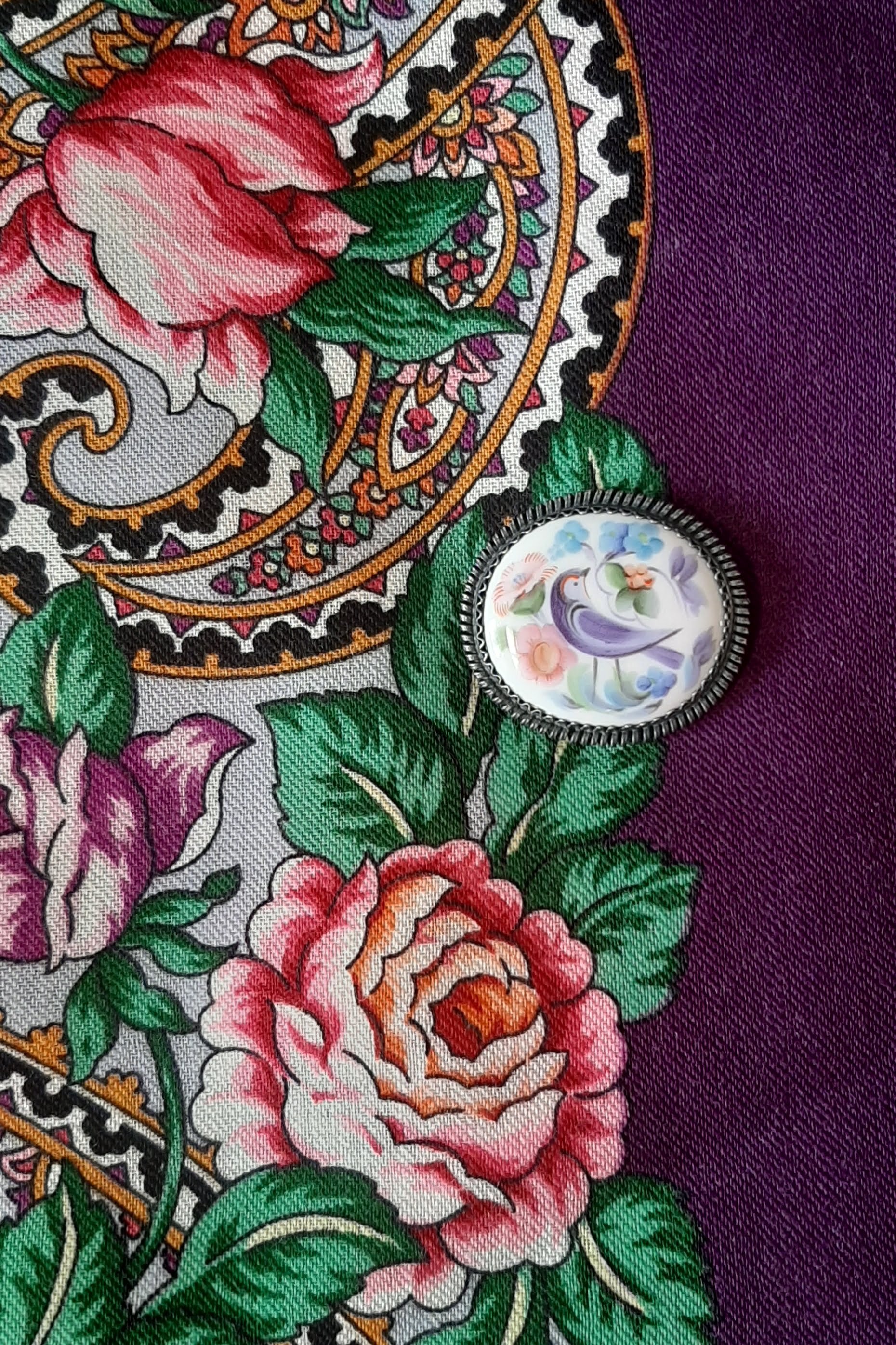 Платок "Родниковый край" 15-го колорита (художник Е. Литвинова) и броши с современной фабричной финифтью