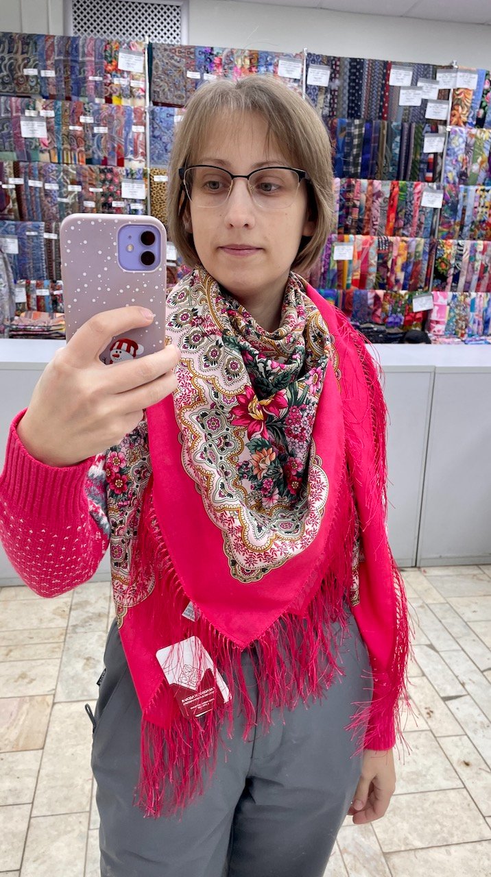 Какая красивая новогодняя примерочная! Всех прекрасных дам поздравляю с Новым Годом! Желаю здоровья и гармонии, чтобы родные и близкие радовали, в доме царили любовь и счастье! Мирного неба! Пусть платочки греют и радуют каждый день и несут красоту в мир. Исполнения платочных желаний! С Новым Годом!