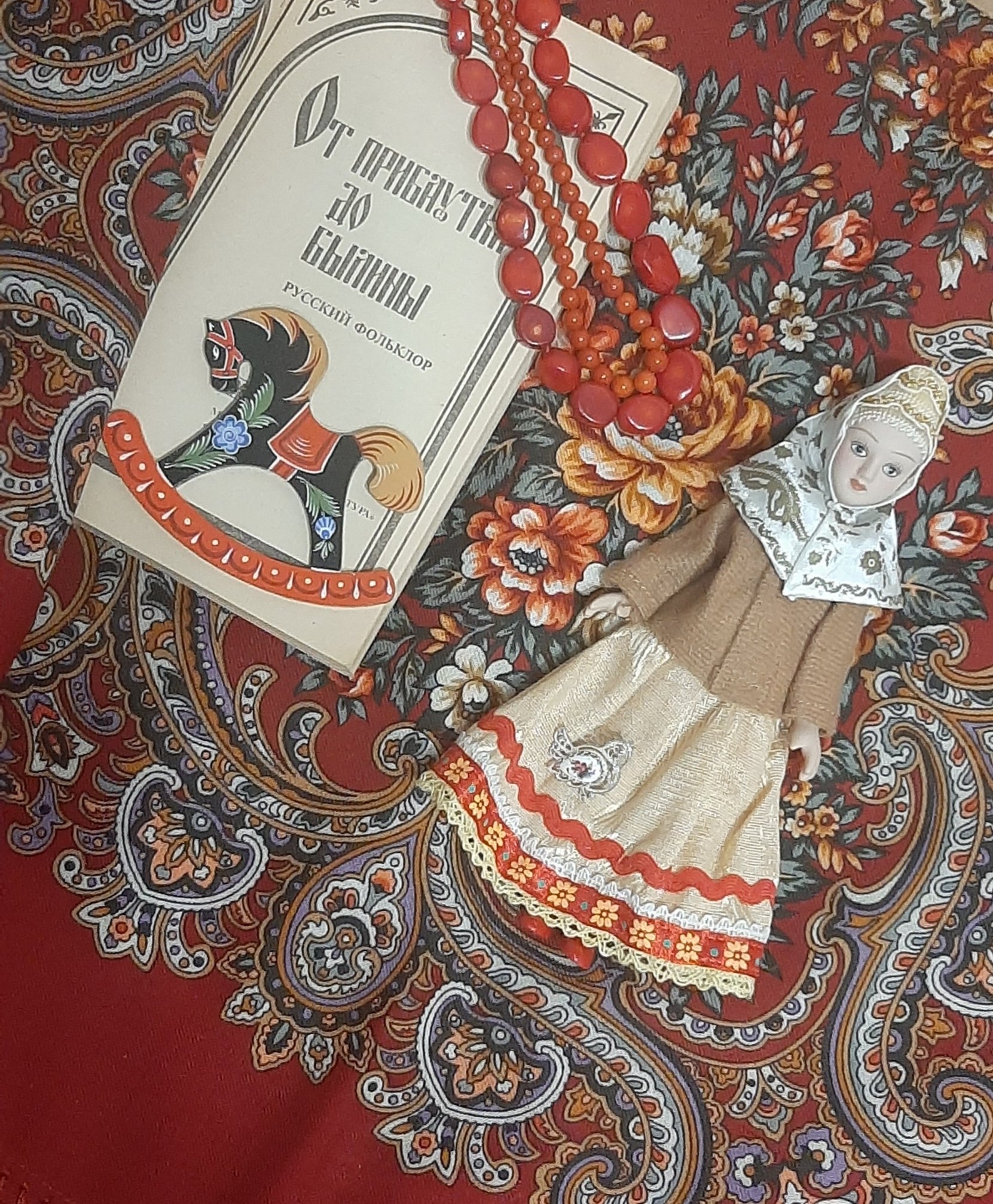 Любимые оттенки красного в платке "Душистый луг" (художник Н. Белокур) , а еще кораллы, финифть, деревянный конь с городецкой росписью и кукла в народном костюме
