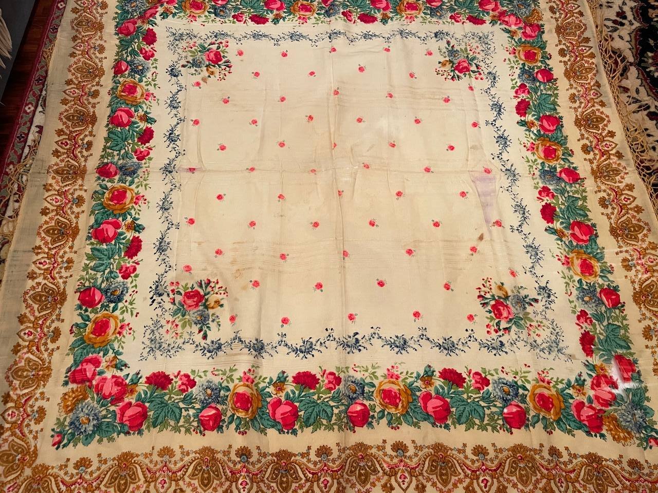 Шаль старинная, 145х152, тонкая шелковистая смесовая ткань (хлопок?/шерсть) высокого качества. Ручная набойка, шерстяная бахрома 15 см частично утрачена. Овальное клеймо 4 см. «К…», дальше не читается. Возможно это именник, но может быть и часть клейма. Со слов продавца период создания 1860-1880 гг???