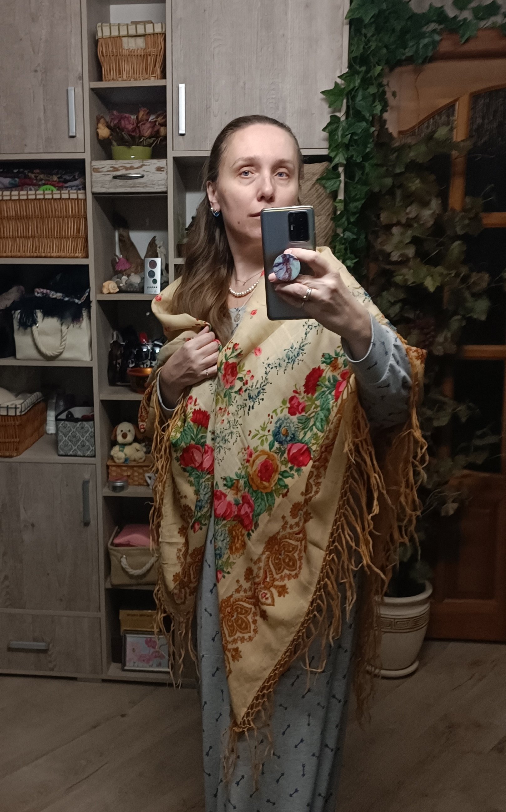 Шаль ППР_21 в колорите 1.1 с каймой цвета крем-брюле (на фото этого почти не заметно, но в реальности она действительно темнее).