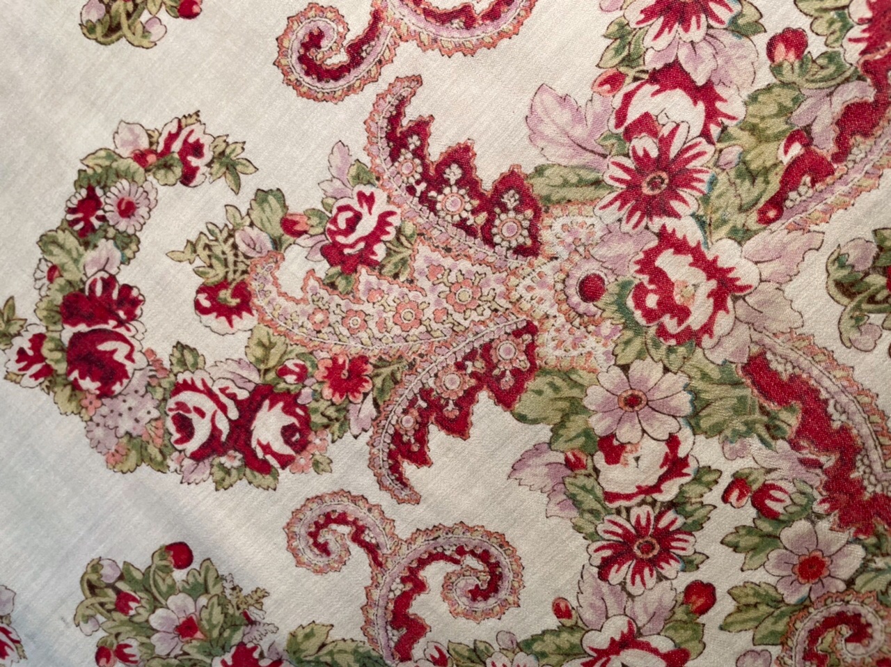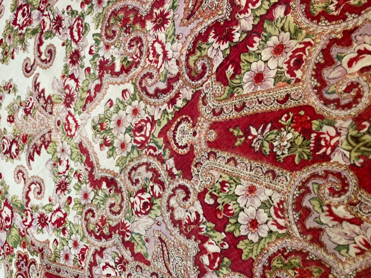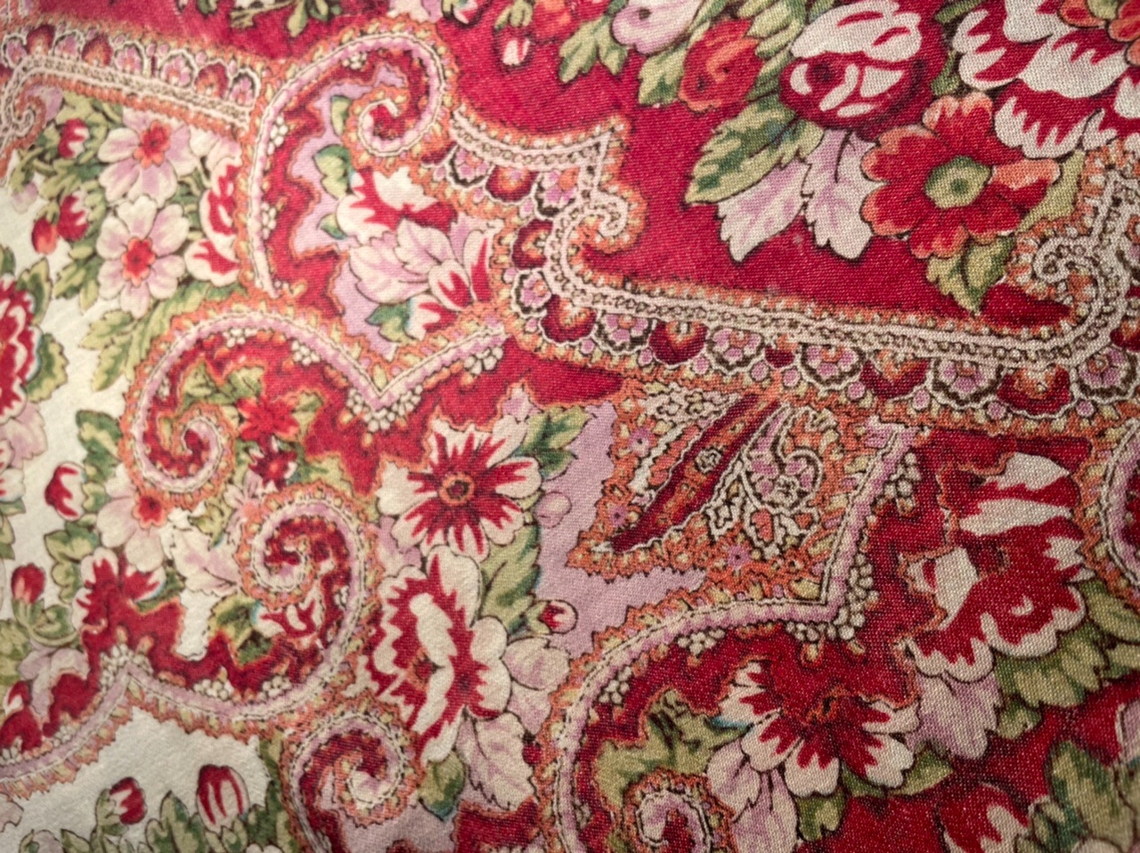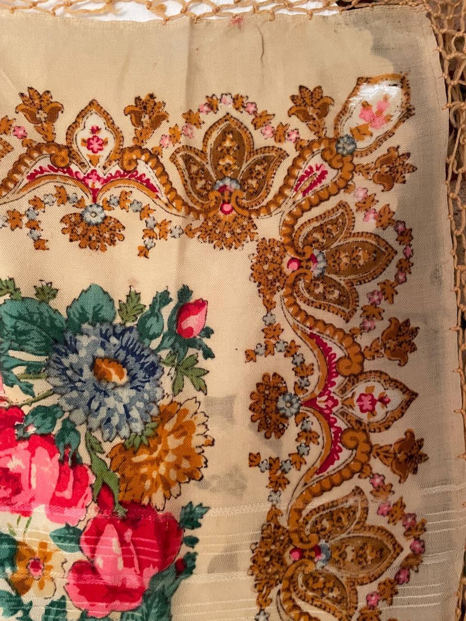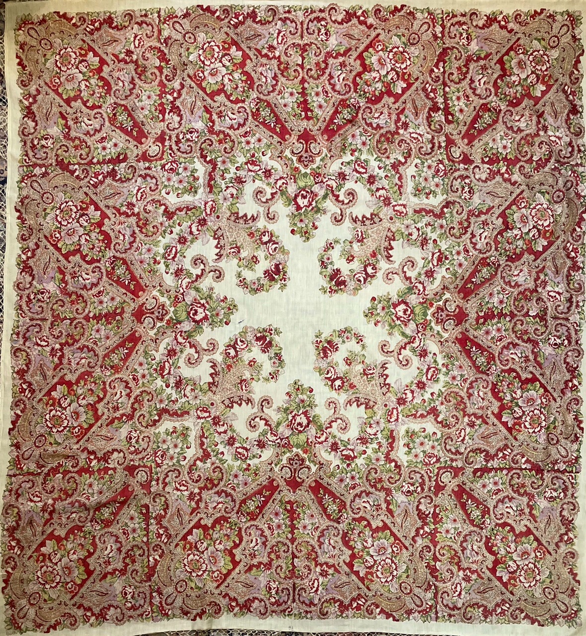 Шаль старинная, 145х152, тонкая шелковистая смесовая ткань (хлопок?/шерсть) высокого качества. Ручная набойка, шерстяная бахрома 15 см частично утрачена. Овальное клеймо 4 см. «К…», дальше не читается. Возможно это именник, но может быть и часть клейма. Со слов продавца период создания 1860-1880 гг???