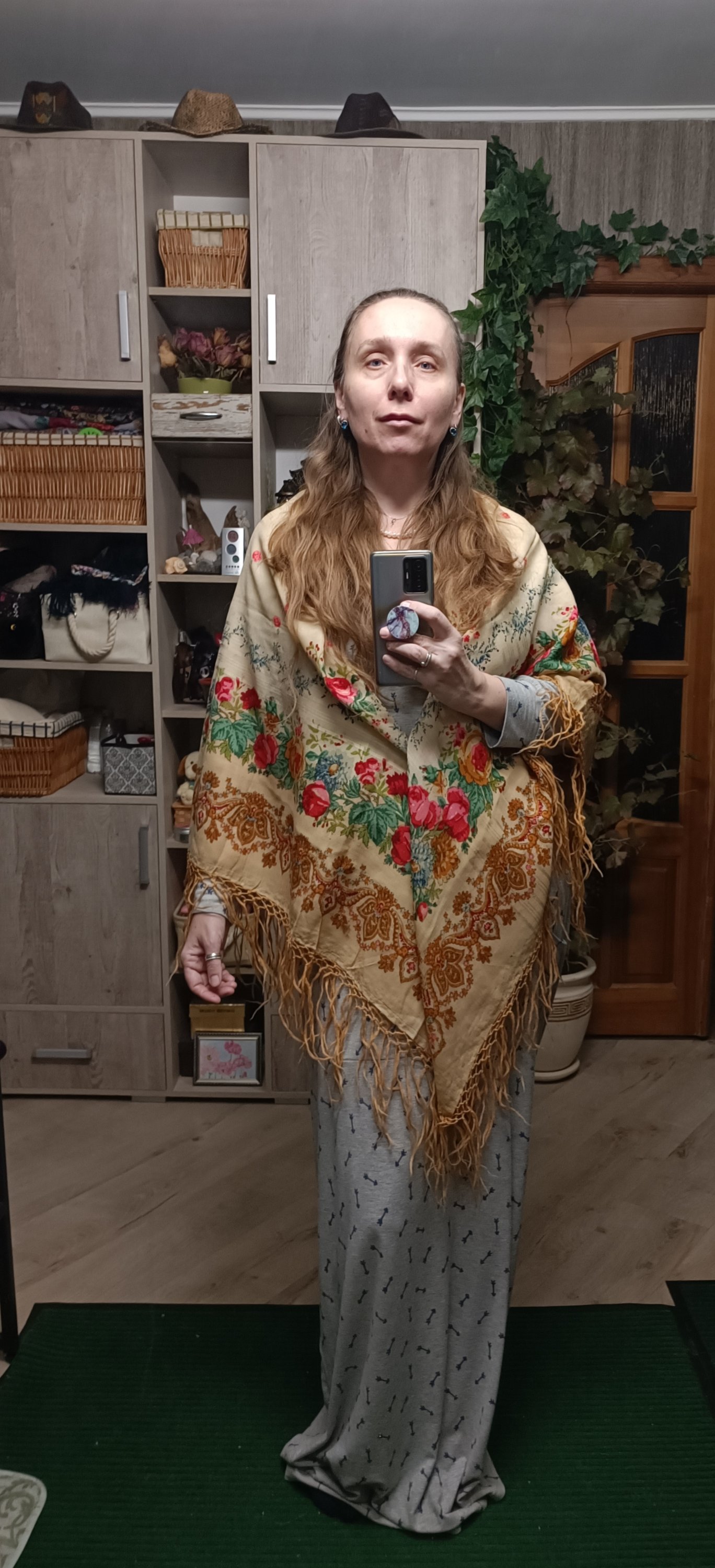 Появилась в коллекции шаль, которая у меня вызывает пока много вопросов. Это связано и с рисунком, и с качеством, и с клеймом.