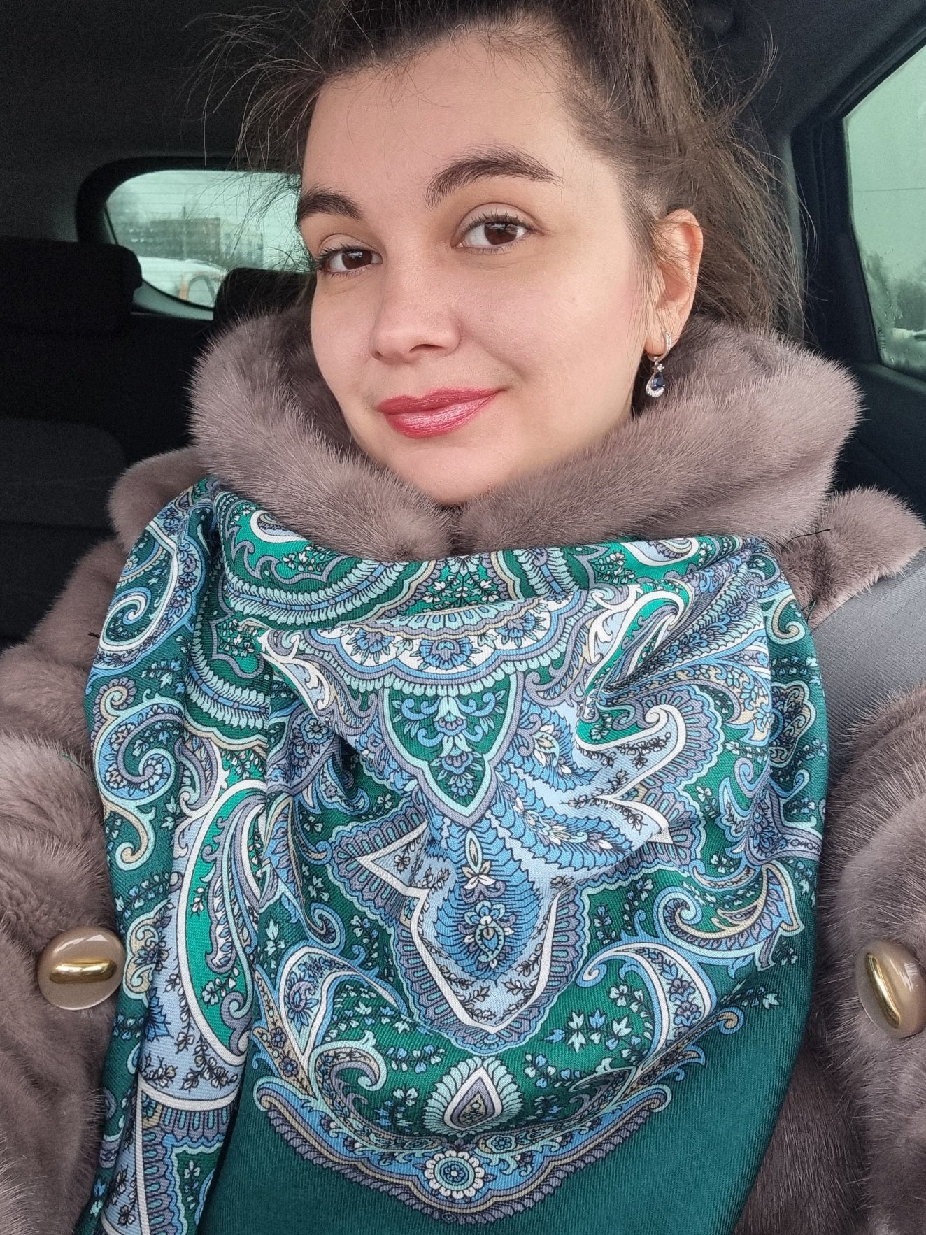 Флеринка, очень вам идет. Особенно нижнее фото понравилось, где вы платок на голову надели. Какой цвет роз красивый