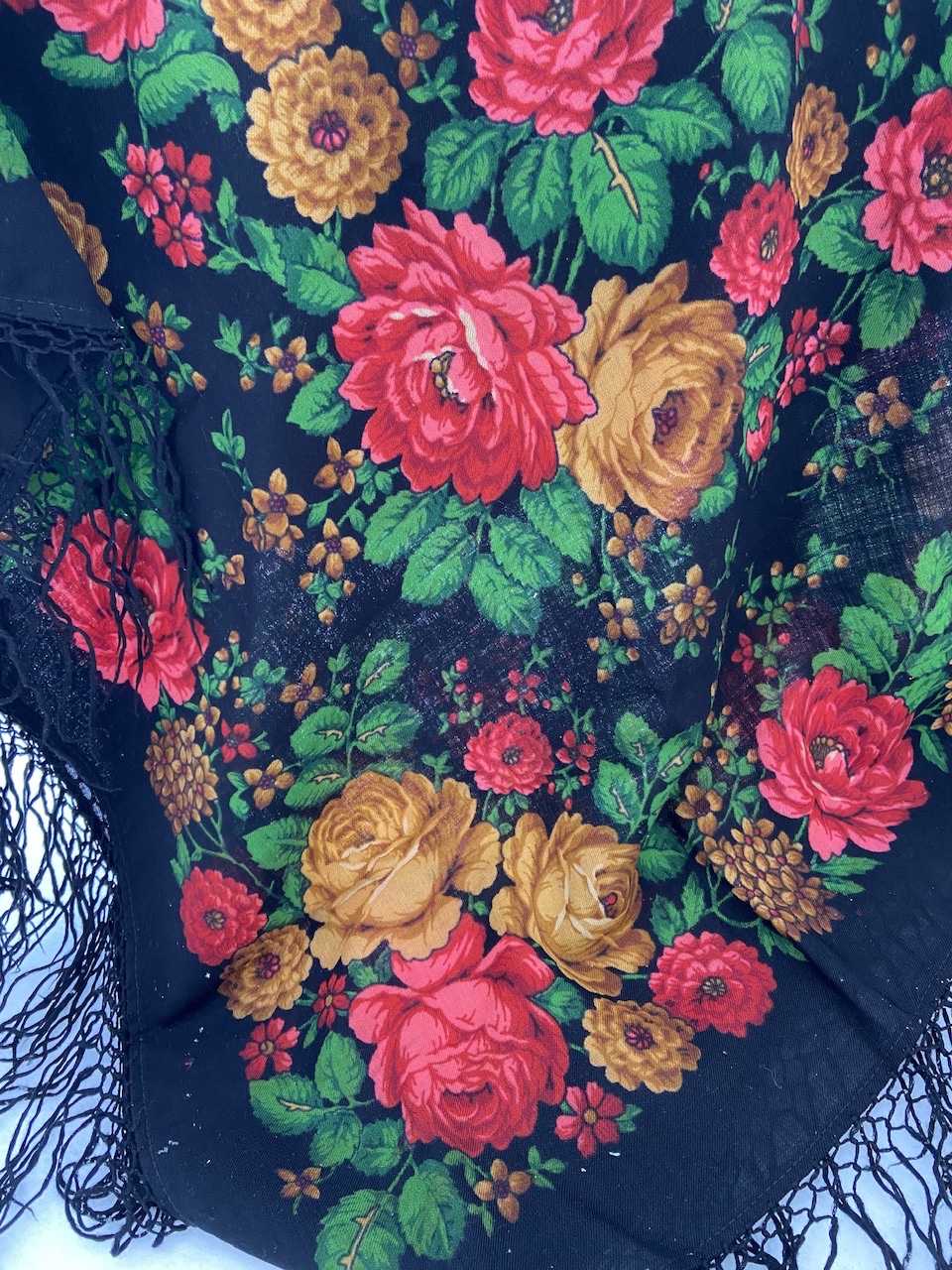 Вот такая интересная шаль 152х148. Жукова сказала, что несомненный Посад. В архиве такую не нашла. При этом бывшая хозяйка говорит, что шаль давным-давно привезла из Англии её мама ей в подарок. Получается, мы экспортировали туда посадские шали. Бахрома длиннющая, до пола, шерсть очень плотная.