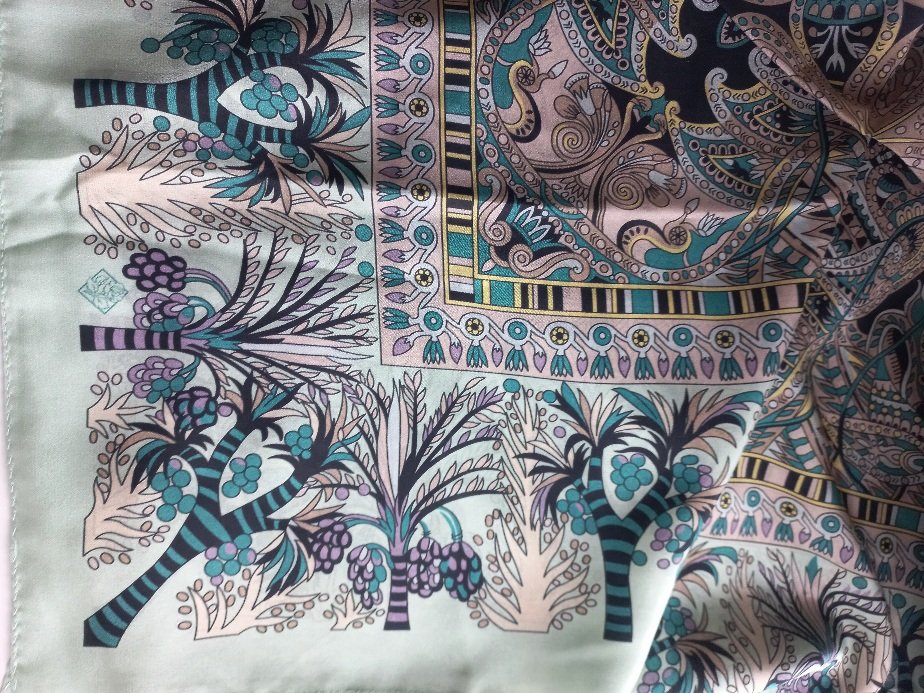 Золото Исиды -первый шелковый платок мануфактуры. При его создании можно было не следовать традициям, а проявить фантазию, пойти на эксперимент, что и мастерски сделала Белокур: при создании крока использовала смешанную технику - рисунок в центре, а финиковые и кокосовые пальмы по кайме сделаны в технике коллажа.Безоблачно писал(а): ↑07 мар 2024, 12:32Золото Исиды не нравится категорически .