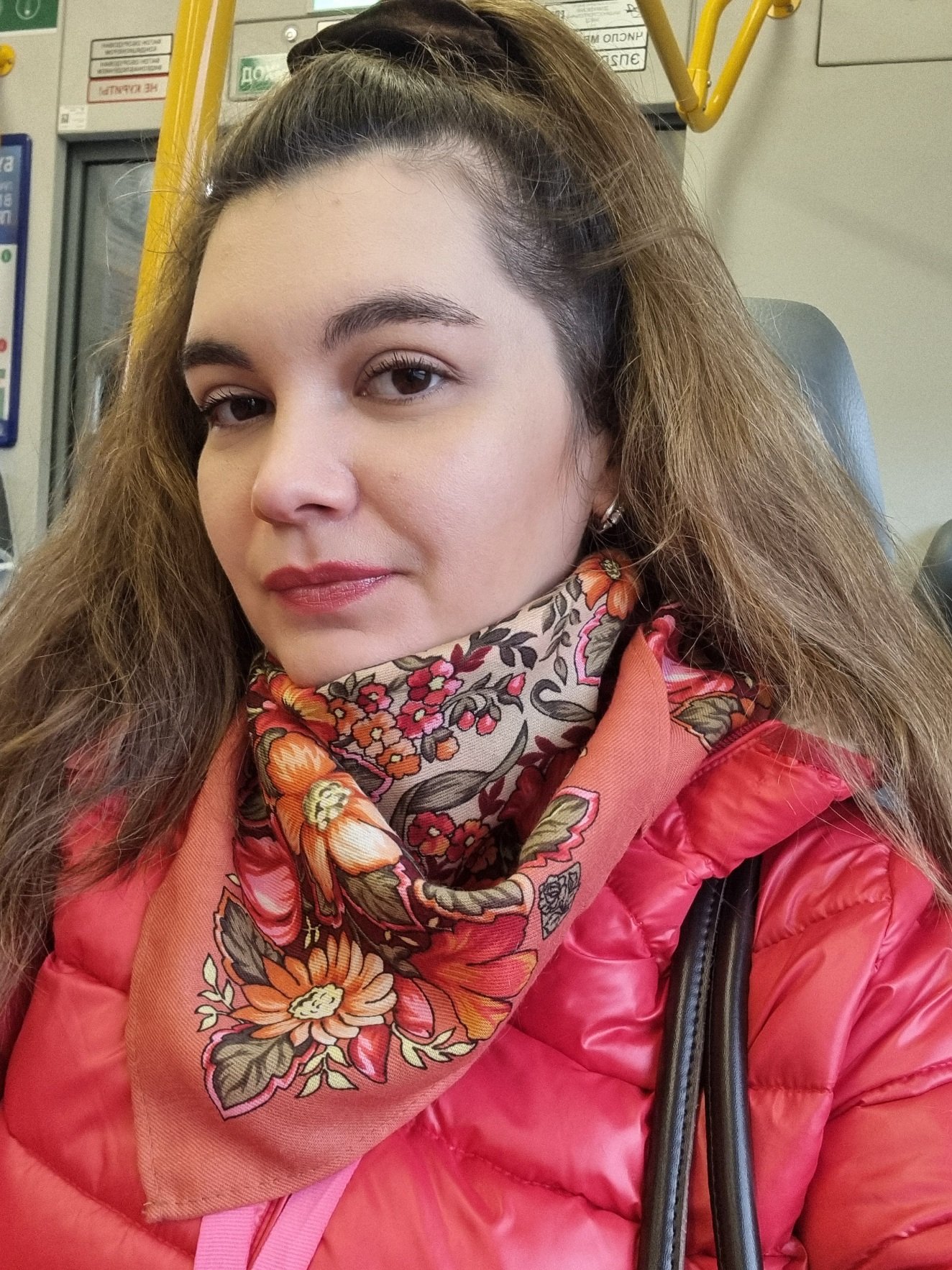 Первые два фото, увы не специалист по колоритам, прекрасно гармонируют и с верхней одеждой и , особенно, к оправе и цвету глаз. Платок прямо" играет"