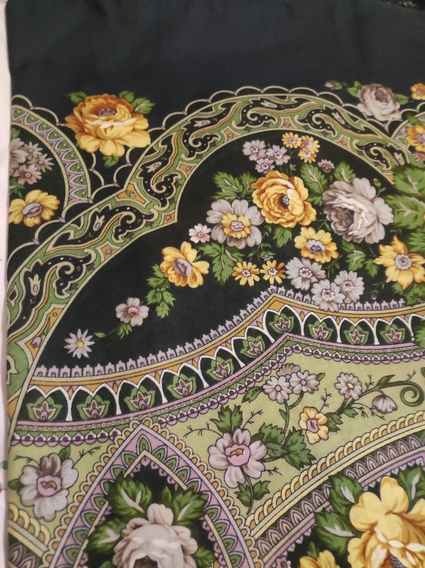 Всем добрый вечер! Смотрю, новые Праздники Покрова никто не показывает. Получила зеленый, показываю. Цвета в основном передались на фото, только стали немного посветлей и поярче. Что могу сказать - был этот платок, продала, о чем потом очень жалела. Помню его зелено-бело-желтым. На новом вместо фарфоровых роз какие-то цементные. Теперь он зелено-серо-желтый. Разочарована. Полезла в архив и поняла, что действительно был такой вариант печати. Очень жаль, что именно его взяли за основу.