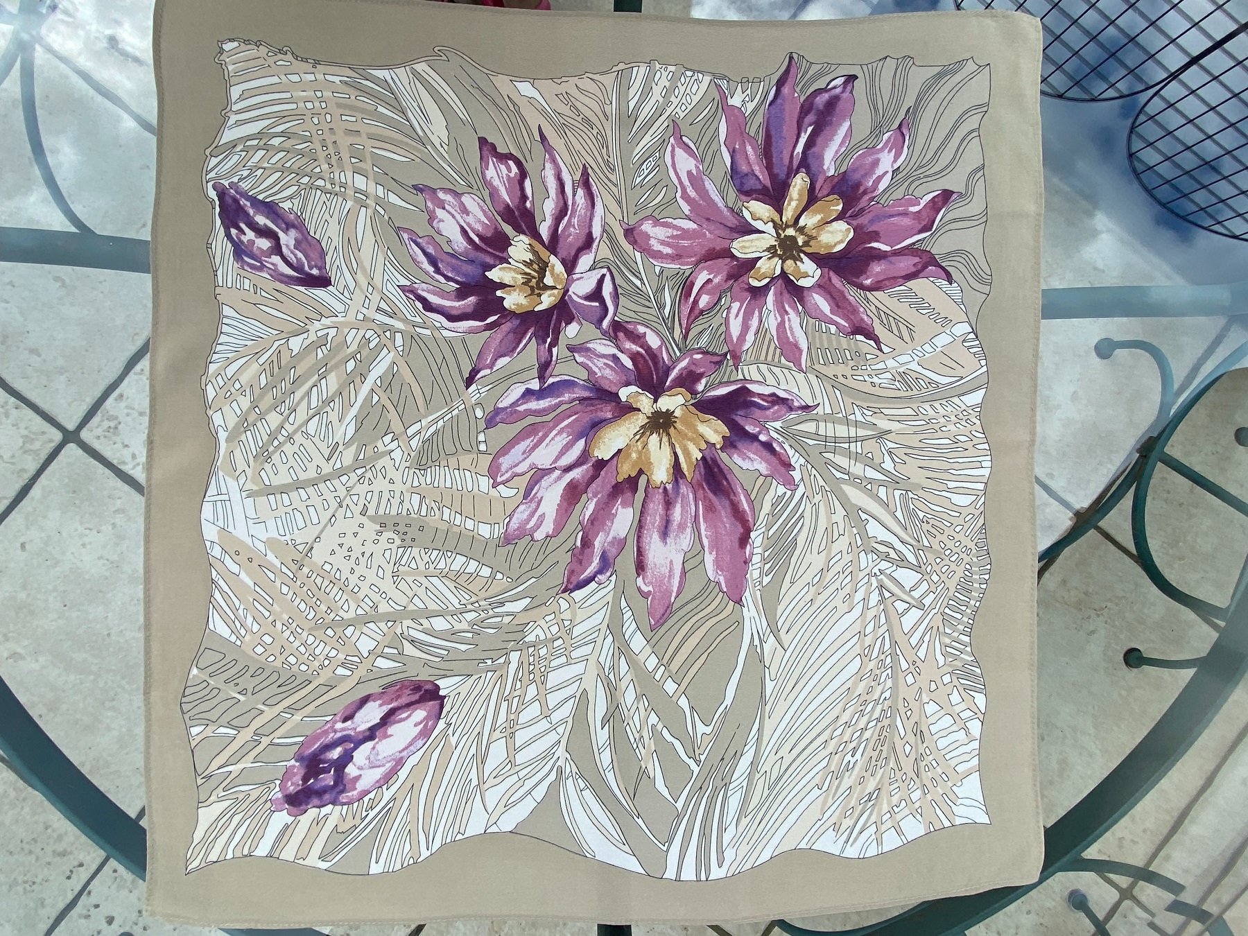 Цвета Тень на песке конечно хамелеонят, как и всё, что на атласе. Выше на странице есть фото Майи этого платка, и у неё он выглядит более серым, чем у меня на фото. Но, и там и там цвета платка довольно правдивые. Он, действительно при разном освещении смотрится то более серым, то более бежевым. Очень красивый, благородный цвет фона.