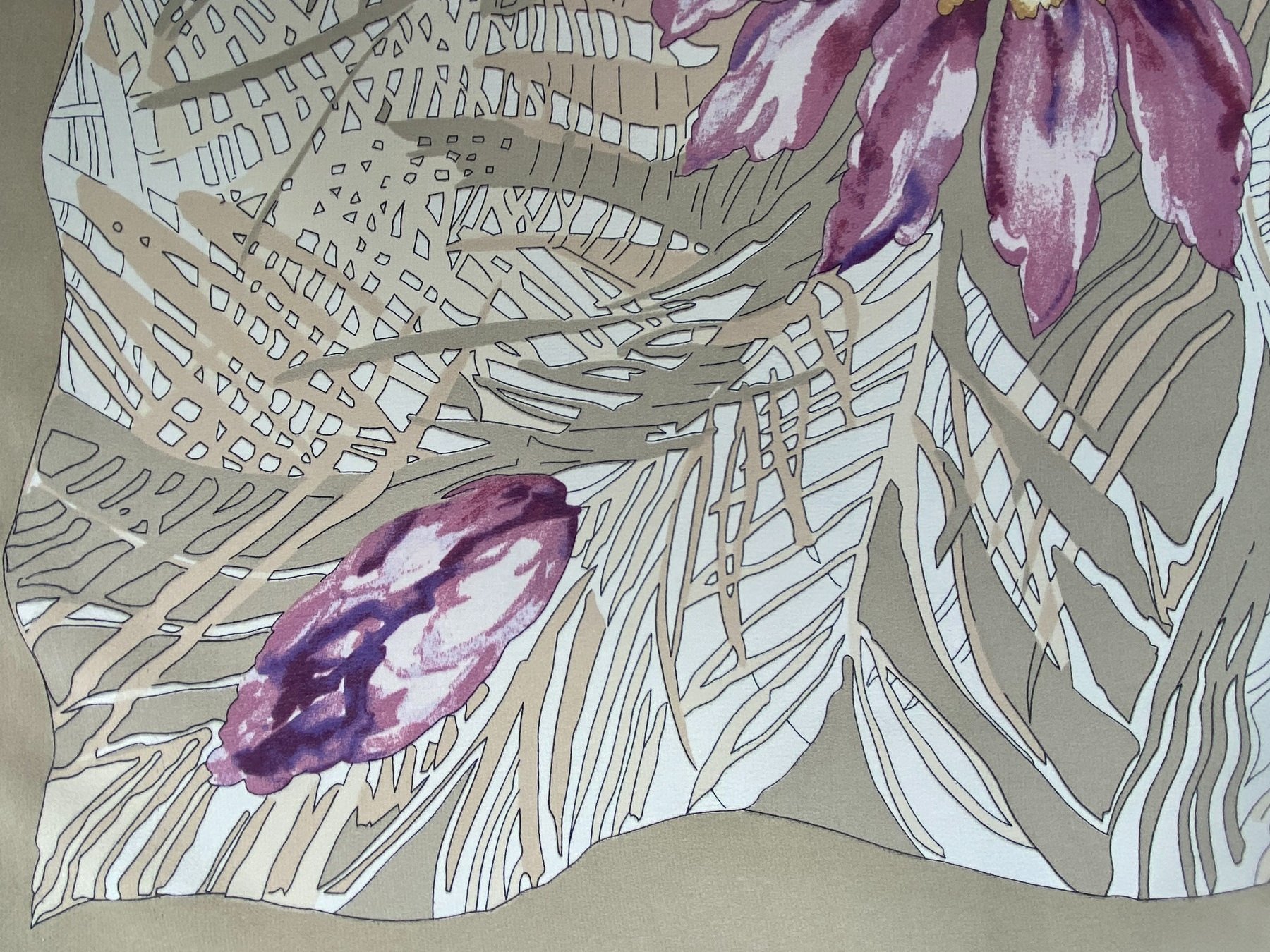 Я уже писала, что вопросов много к печати, причины могут быть в качестве сетки для печатных форм, красках, материале. В данном случае думаю, что растр на стадии компьютерного изготовления шаблонов стал зерном. Фон залили одним цветом, а в цветах оттенки слоями и оставили как растянули.