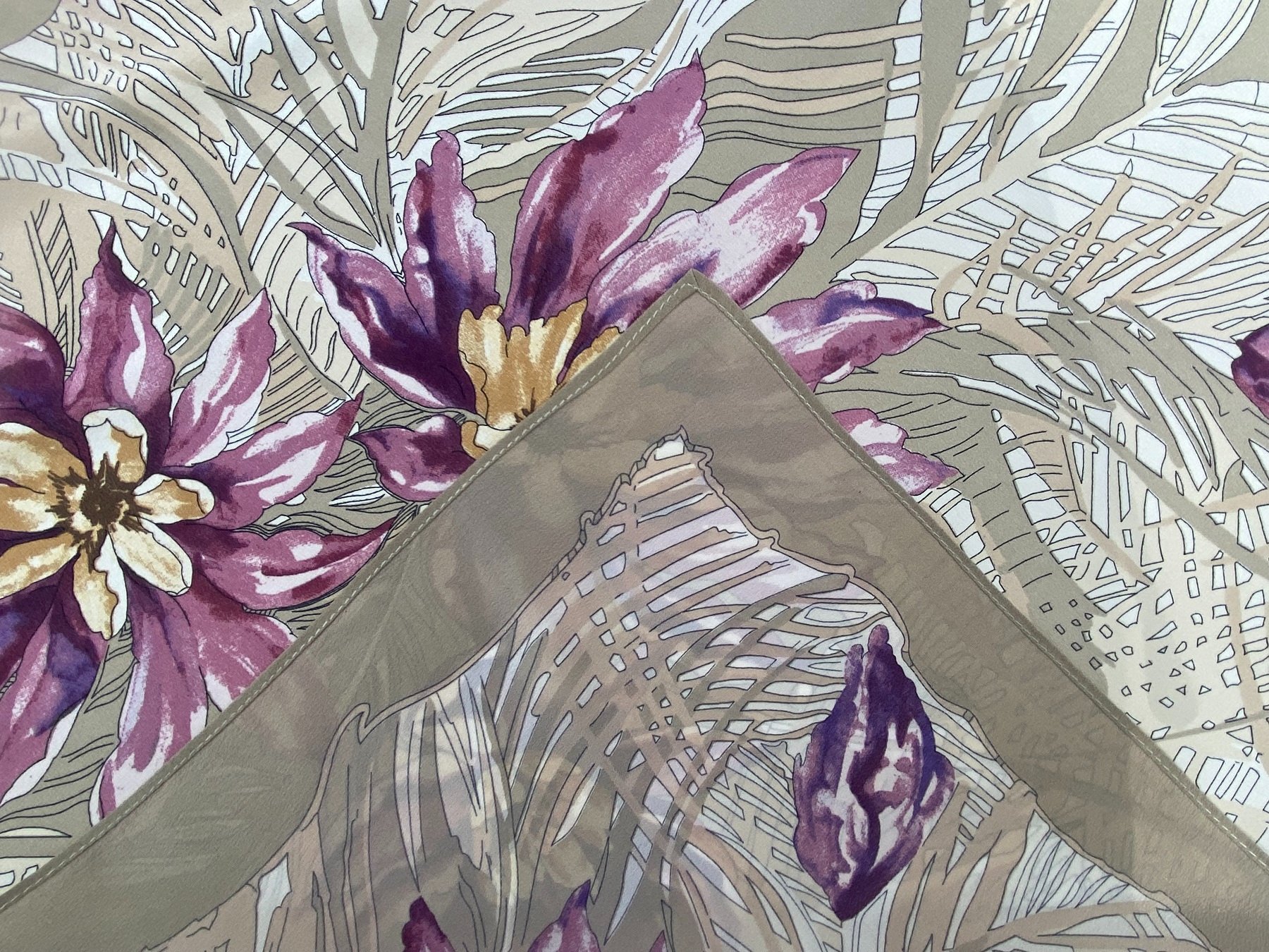 Цвета Тень на песке конечно хамелеонят, как и всё, что на атласе. Выше на странице есть фото Майи этого платка, и у неё он выглядит более серым, чем у меня на фото. Но, и там и там цвета платка довольно правдивые. Он, действительно при разном освещении смотрится то более серым, то более бежевым. Очень красивый, благородный цвет фона.