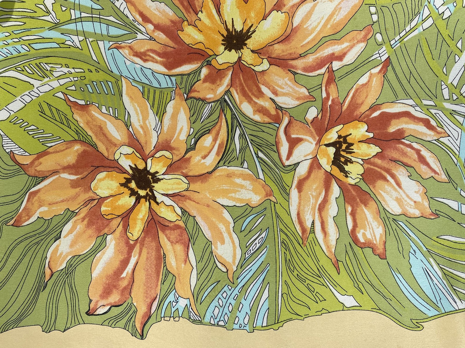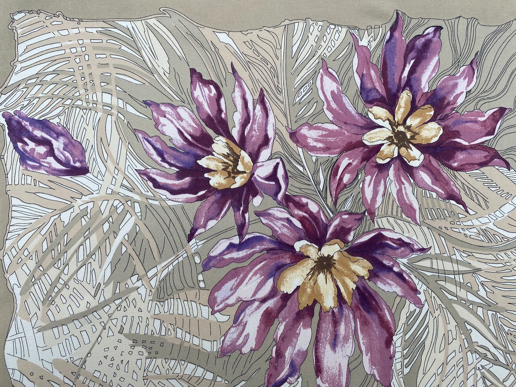 Я уже писала, что вопросов много к печати, причины могут быть в качестве сетки для печатных форм, красках, материале. В данном случае думаю, что растр на стадии компьютерного изготовления шаблонов стал зерном. Фон залили одним цветом, а в цветах оттенки слоями и оставили как растянули.