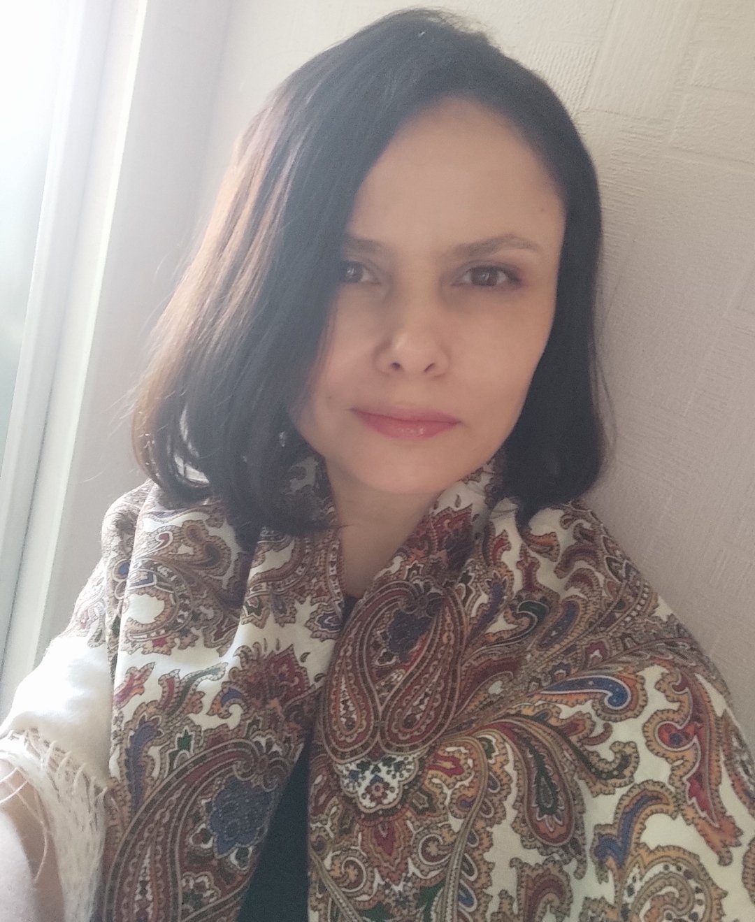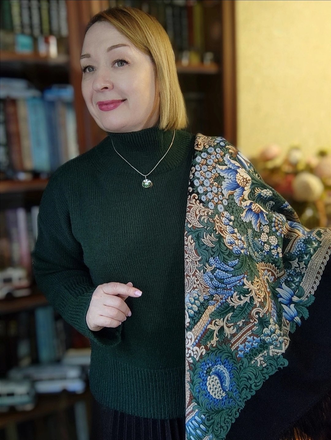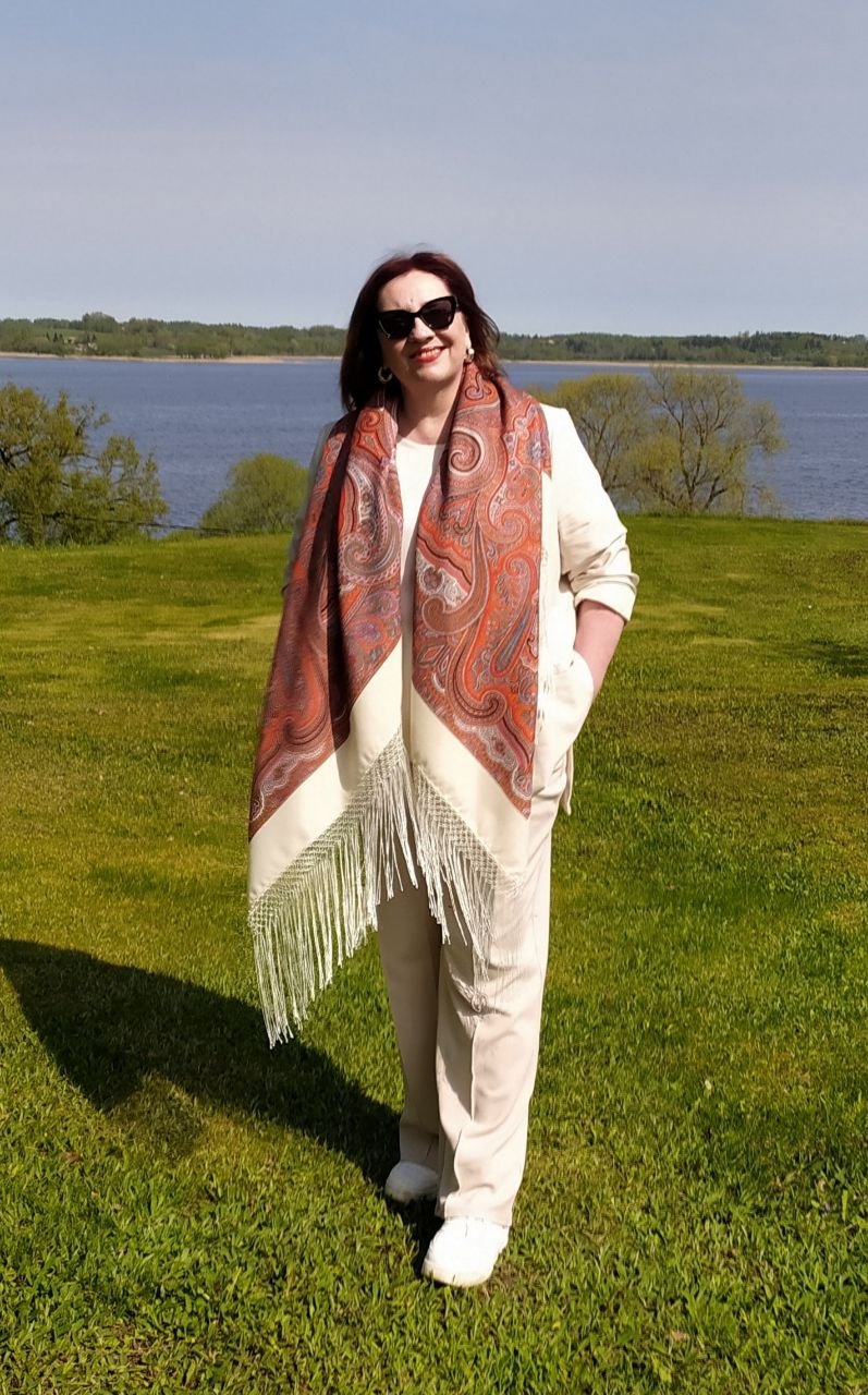 Надя, платок мне показался довольно сложным, но на вас он мягок и очень органично воспринимается с вашими цветами .