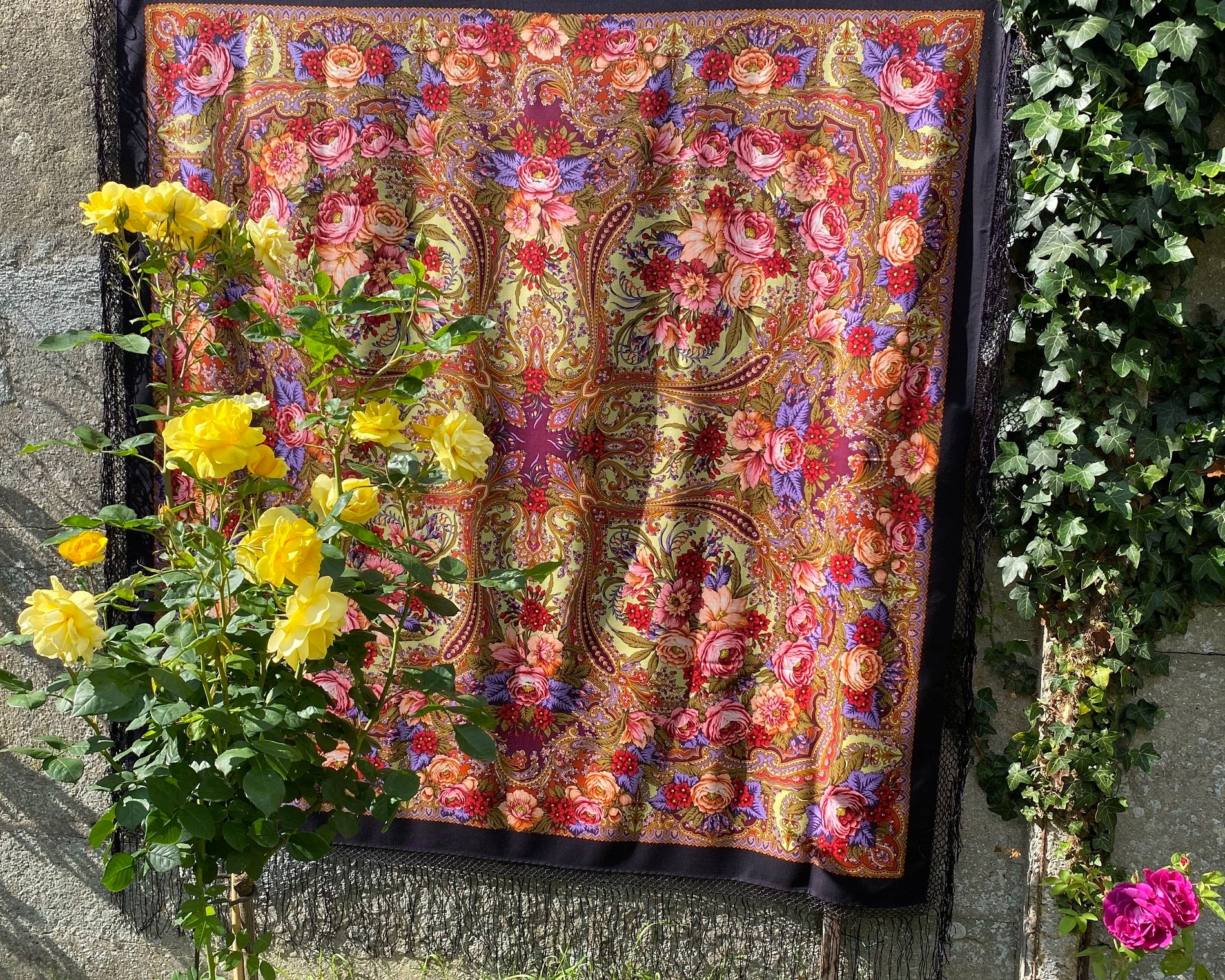 Роза выглядит, словно с шали оторвалась и упала. Идеально.