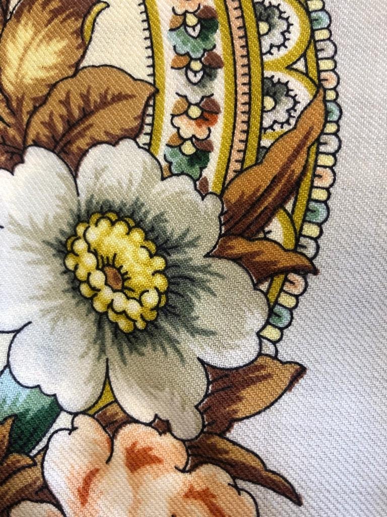 На этот раз заказан был долгожданнейший Март 3-го колорита, которого не было в каталоге, если не ошибаюсь, лет несколько. Причем, незадолго до этого мне этот Март встретился в дисконтном отделе в 3-м сорте на ткани прекрасного качества, белоснежный (почти)с отличной печатью, но с огромной красной полосой краски по всей кайме, которая (полоса) исключала покупку данного экземпляра. Но я обрадовалась. Значит, печатают, и скоро, видимо, появится на сайте. И да. Через несколько дней посчастливилось-таки заказать один из двух мелькнувших на сайте платочков.