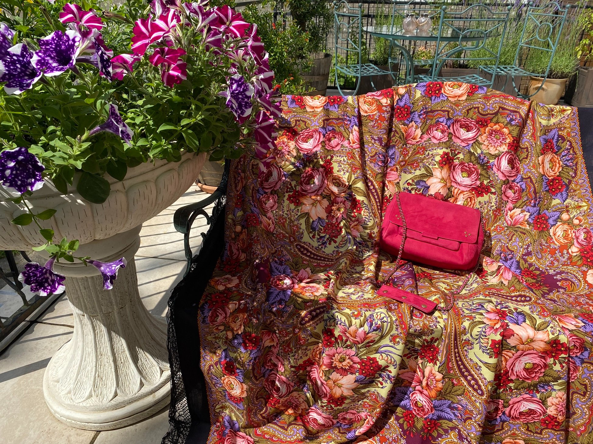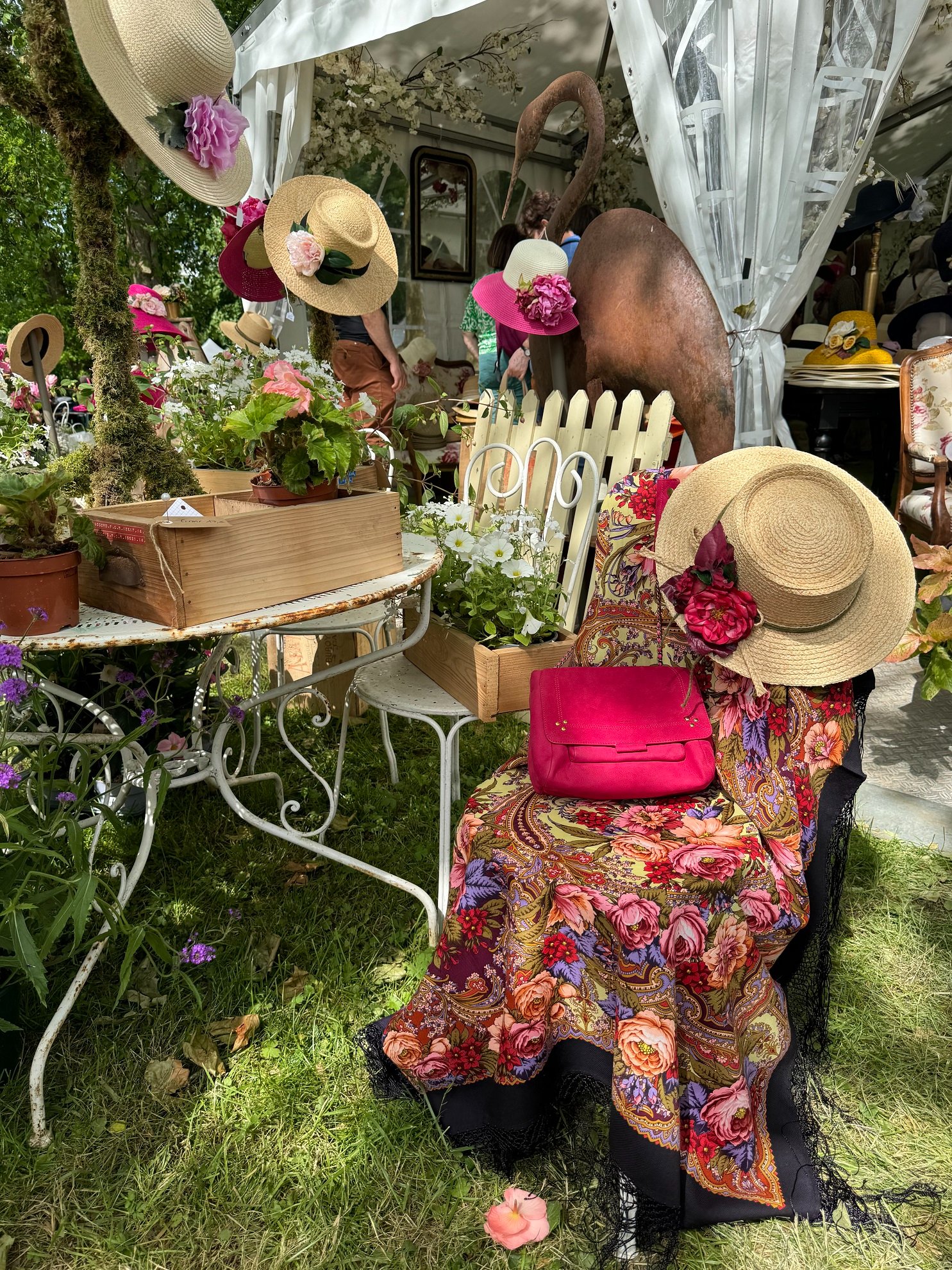 Помимо цветов, было немало стендов с самым разным сопутствующим товаром. Очень оживленно было в шляпных павильонах, многие посетители обоего пола были в шляпах, в основном соломенных, многие дамы - в платьях цветочных расцветок. И платкам Валерии Фадеевой среди моря роз, древних развалин и архитектурно-скульптурно-живописного антуража было самое место.