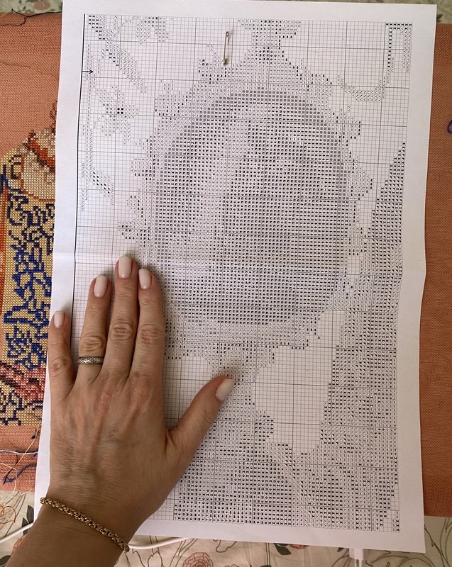 Подскажите, а Вы по бумаге ее вышиваете или по саге? Как схема? Какой размер? Поди простынка, как большинство у Теи. Видела,что дама крупная,:но все же. Крупная крупной рознь.