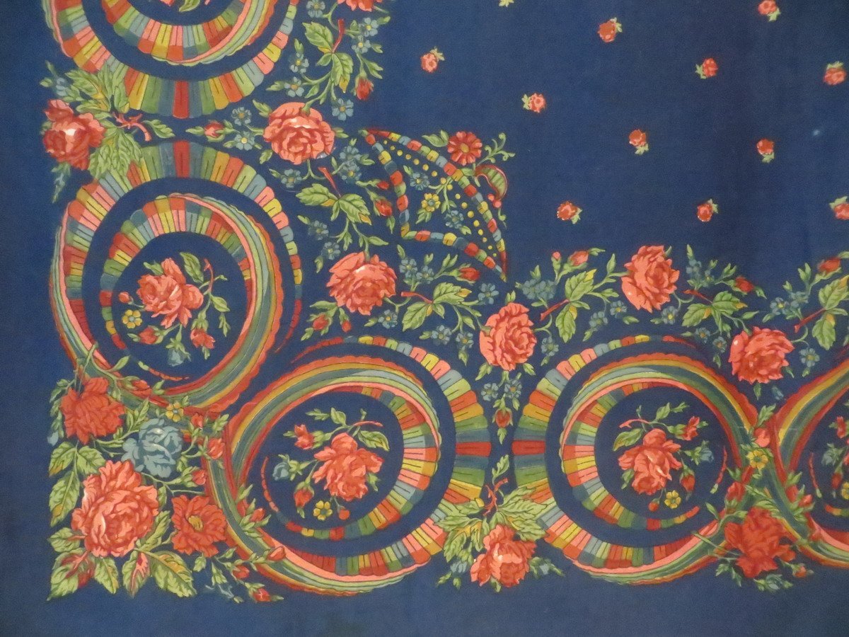 На синем платке, помимо необычных геометрических элементов, необычны и розы.