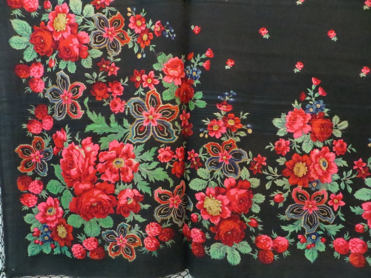 Как интересно: на черногрунтовой шали совершенно реалистичные цветы сочетаются с весьма схематичными. И здорово ведь!