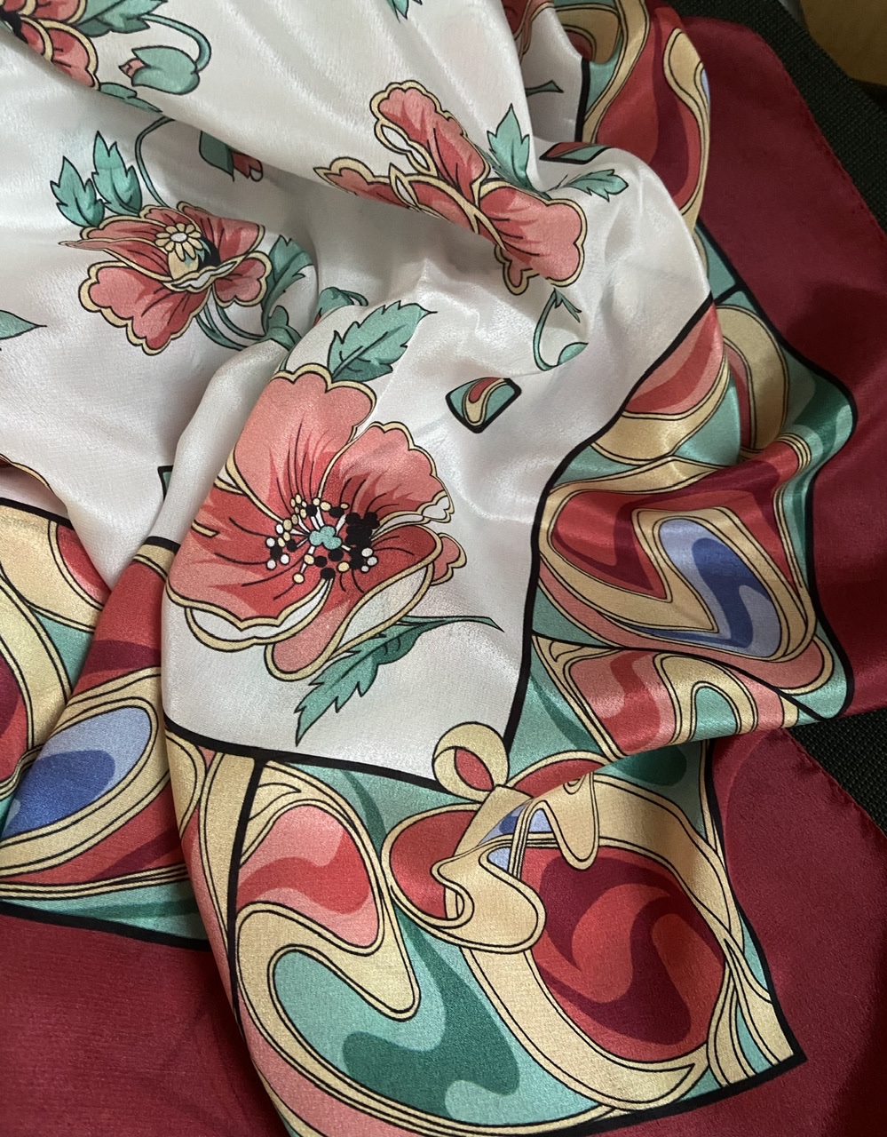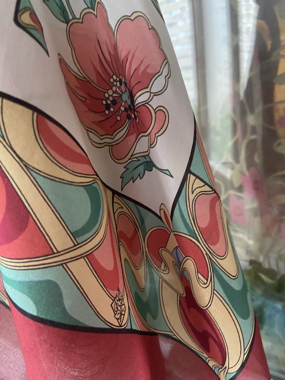 Ткань жесткая, мне нравится. Все равно это шелк, к коже очень приятно. Блеск присутствует. У него много винтажности в рисунке, и ткань это подчеркивает.