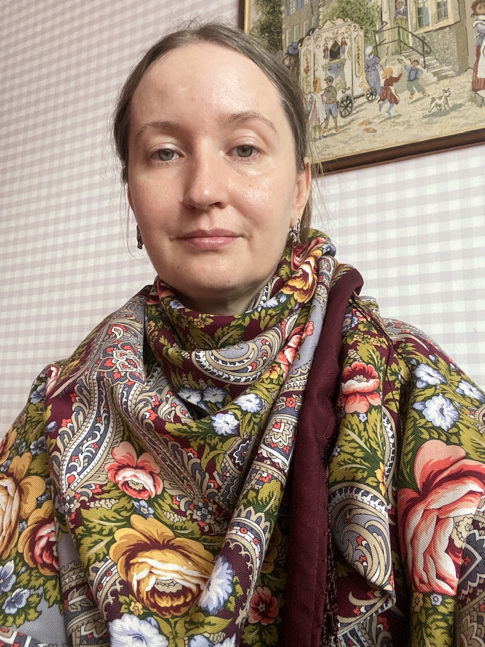 Елена А , шаль вам очень идет. А желто-зеленые листики и серый цвет в орнаменте подчеркивает глубину глаз.
