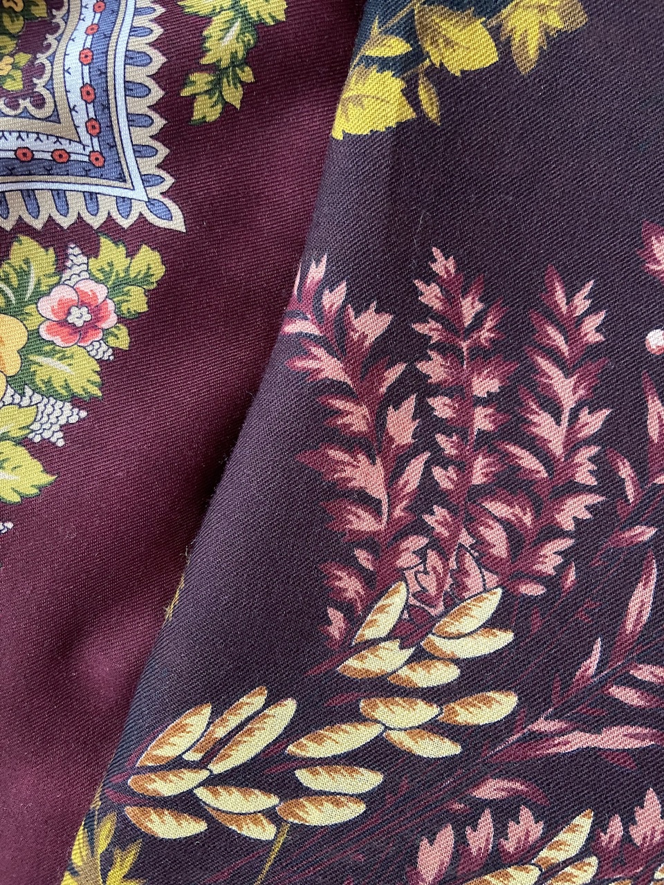Я тут смогла живьем увидеть и даже примерить новый 5-ый колорит Лета в Павлове: мне понравился! Идет. Заливка фона роскошная винная, ну я так вижу там бордо с капелюшкой фиолета, по памяти напомнило немного любимый Нежный вечер-7, серый божественно темноват и густоват. Даже листья не такие агрессивно-зеленые: на фото они намного ярче, а в жизни достаточно доброжелательны ко мне.