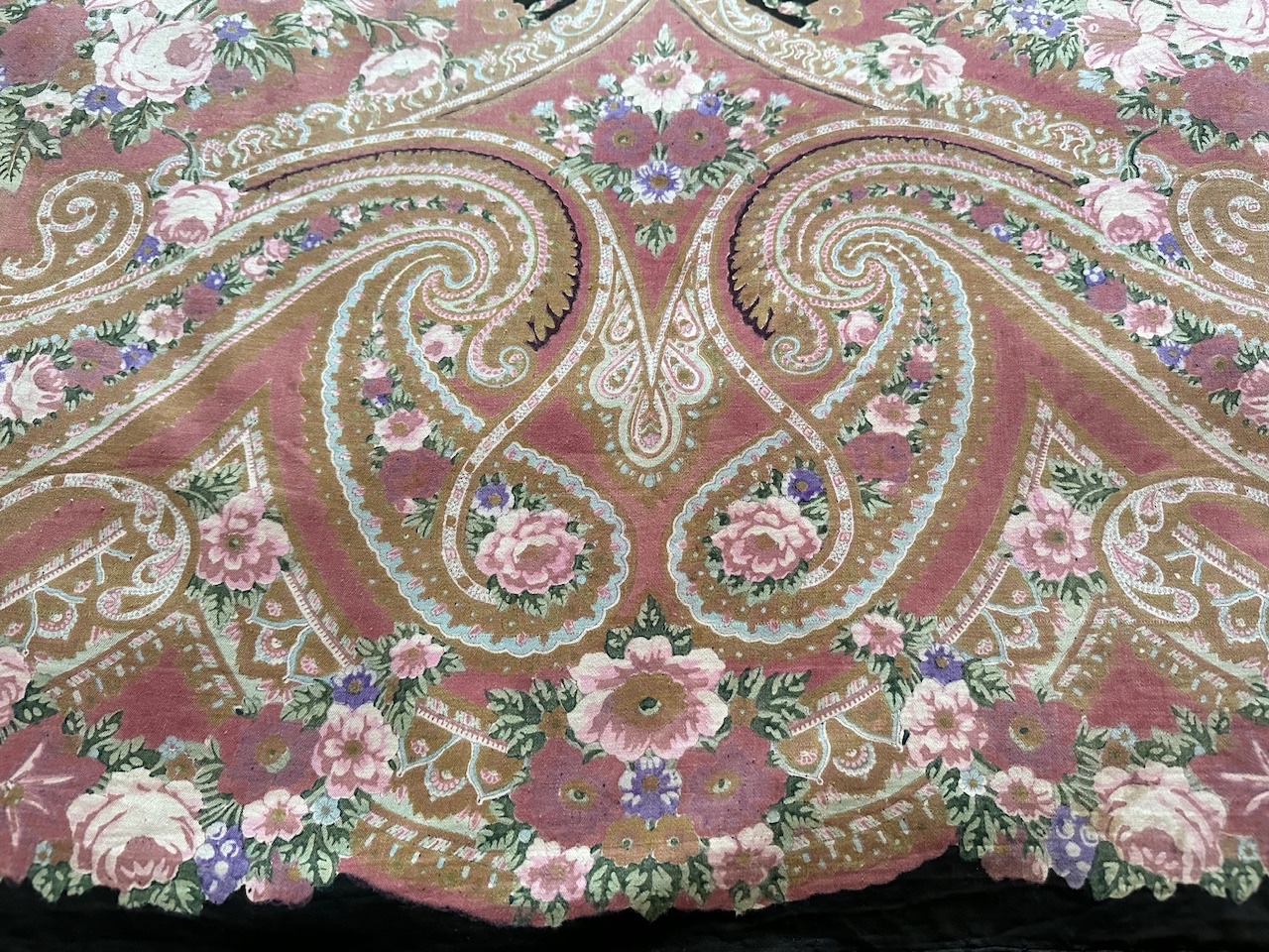 У вас замечательная старинная шаль ручной набойки с цветочным мотивом. Время её создания угадать сложно, но я бы определила между 1910 и 1925 годами прошлого века. Думаю, шали более 100 лет. Если она принадлежала вашей семье, напишите, известна ли вам её история. Если на изнаночной стороне отсутствует фабричное клеймо, то место производства точно определить невозможно. Как-то так. Если вам как-то помогла, буду рада.