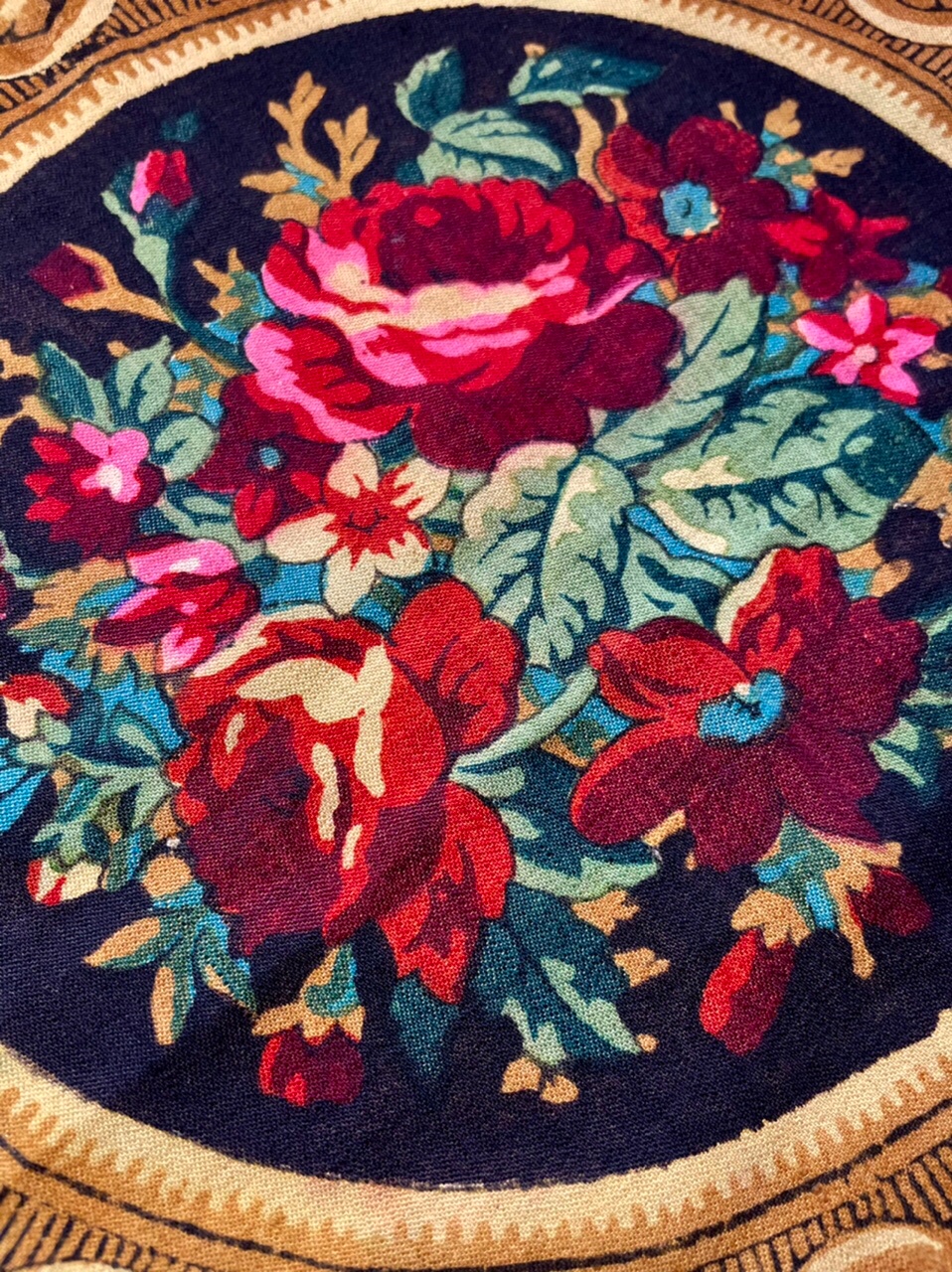 Старинная шаль, 142х145, ручная набойка на смесовой ткани саржевого плетения (хлопок и шерсть). Шаль переподшита и перевязана бахрома. Клейма нет. Производитель не подтвержден.