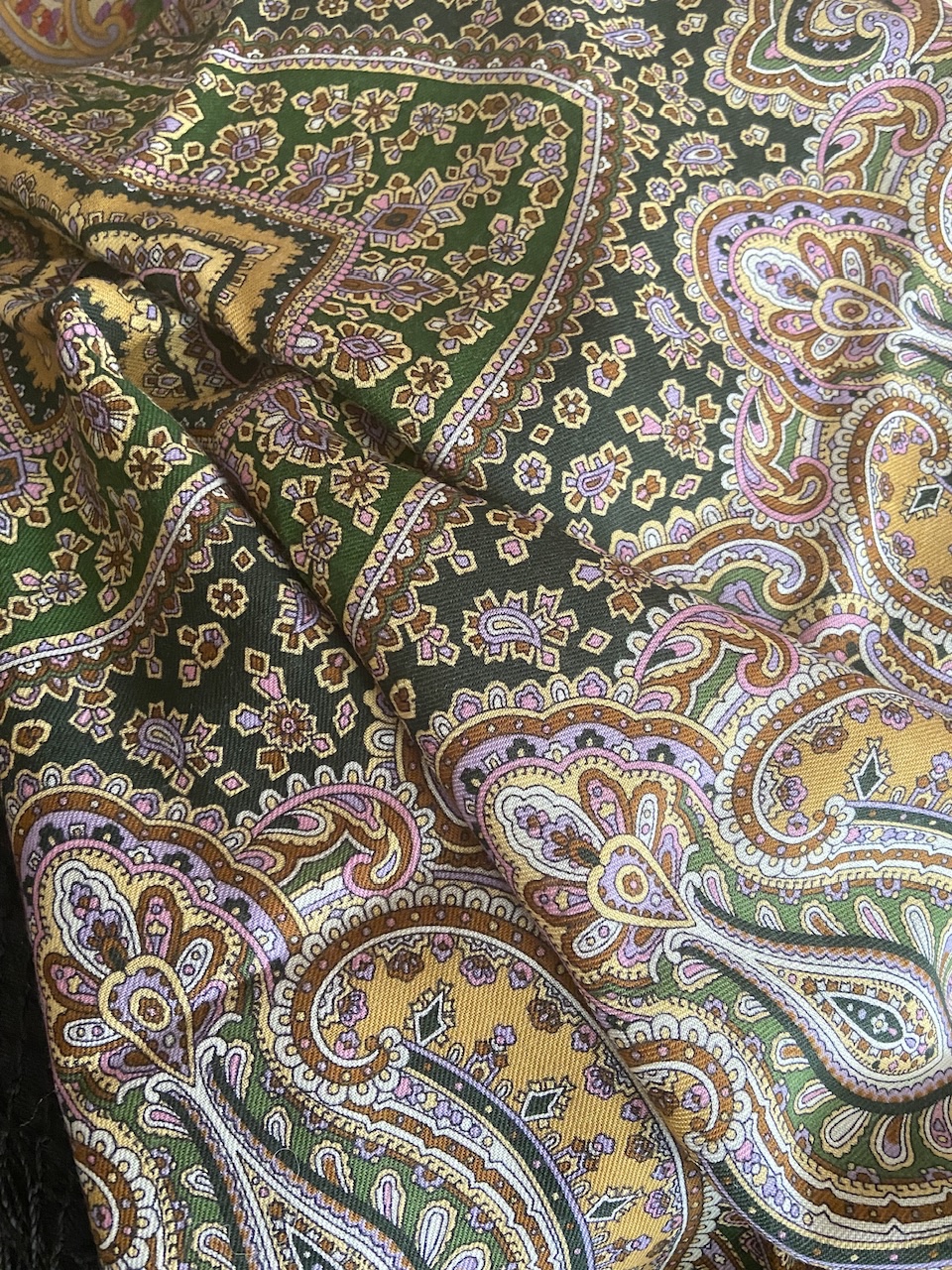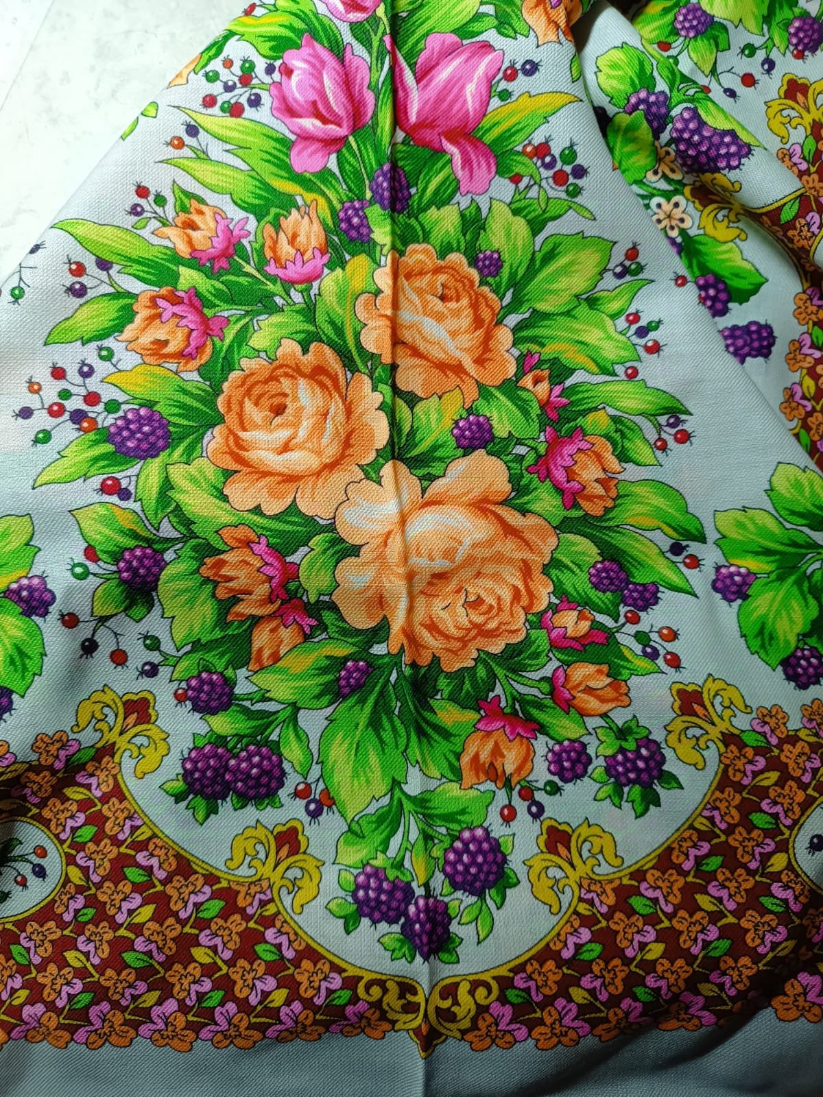 Какая красотка! Еще и именная шалечка! Мои поздравления, отличная находка. По колориту не подскажу. Бахрома шерсть или вискоза? Кажется, что вискоза, значит, не такая уж старинка. Есть ощущение, что это все же вариант печати 18 колорита, просто затемненный, но заливка медальонов не серая, наверное все же не 18