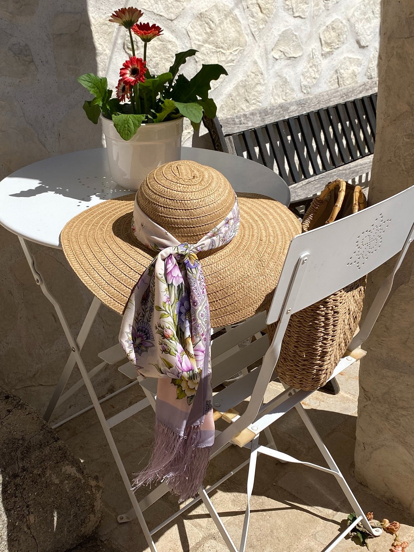 Красиво смотрятся на соломке шелковые платки и шарфы, и держатся хорошо.