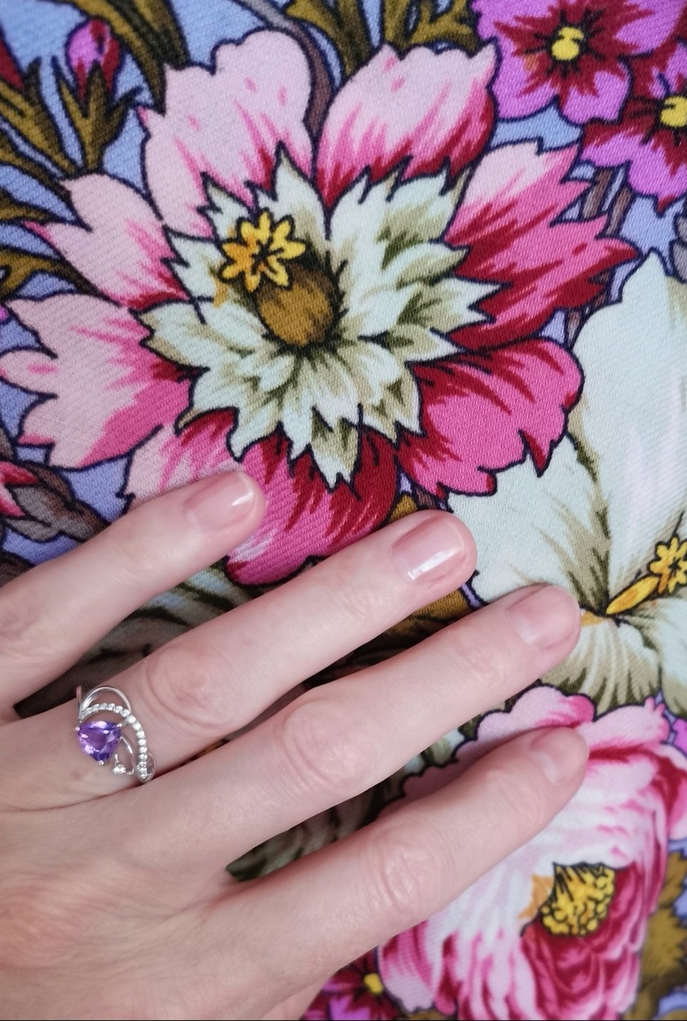 Действительно чудесная шаль. И идеальна к этому платью. Аметист, если это он и я не ошиблась, прекрасно сюда подходит. Правда я бы выбрала камень чуть чуть больше, размер цветов позволяет. ^%