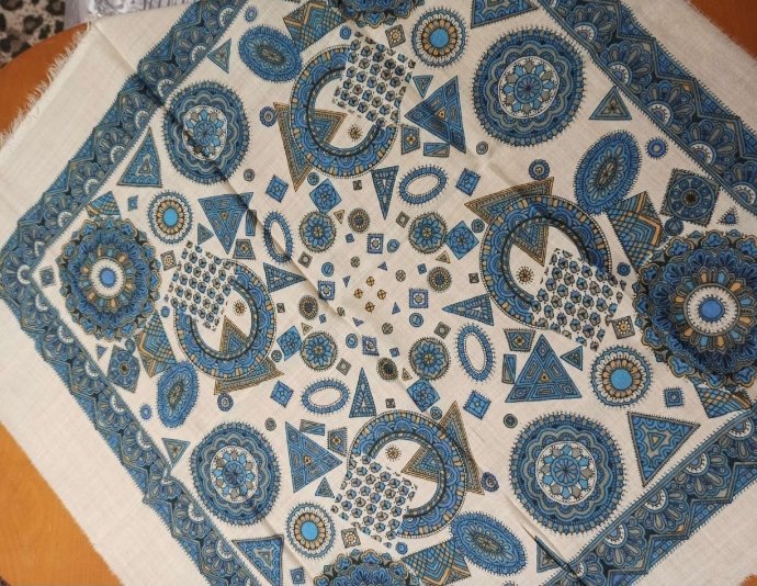 Купила на Авито очень яркий платочек, неизвестного происхождения на горчично-желтом грунте. Размер 85 х 85 см. Ткань толстая, колючая, полотняного переплетения. Печать неидеальная, с большим количеством смещений, но, на мой взгляд, общий вид это не портит. Платочек просто витаминка для глаз.