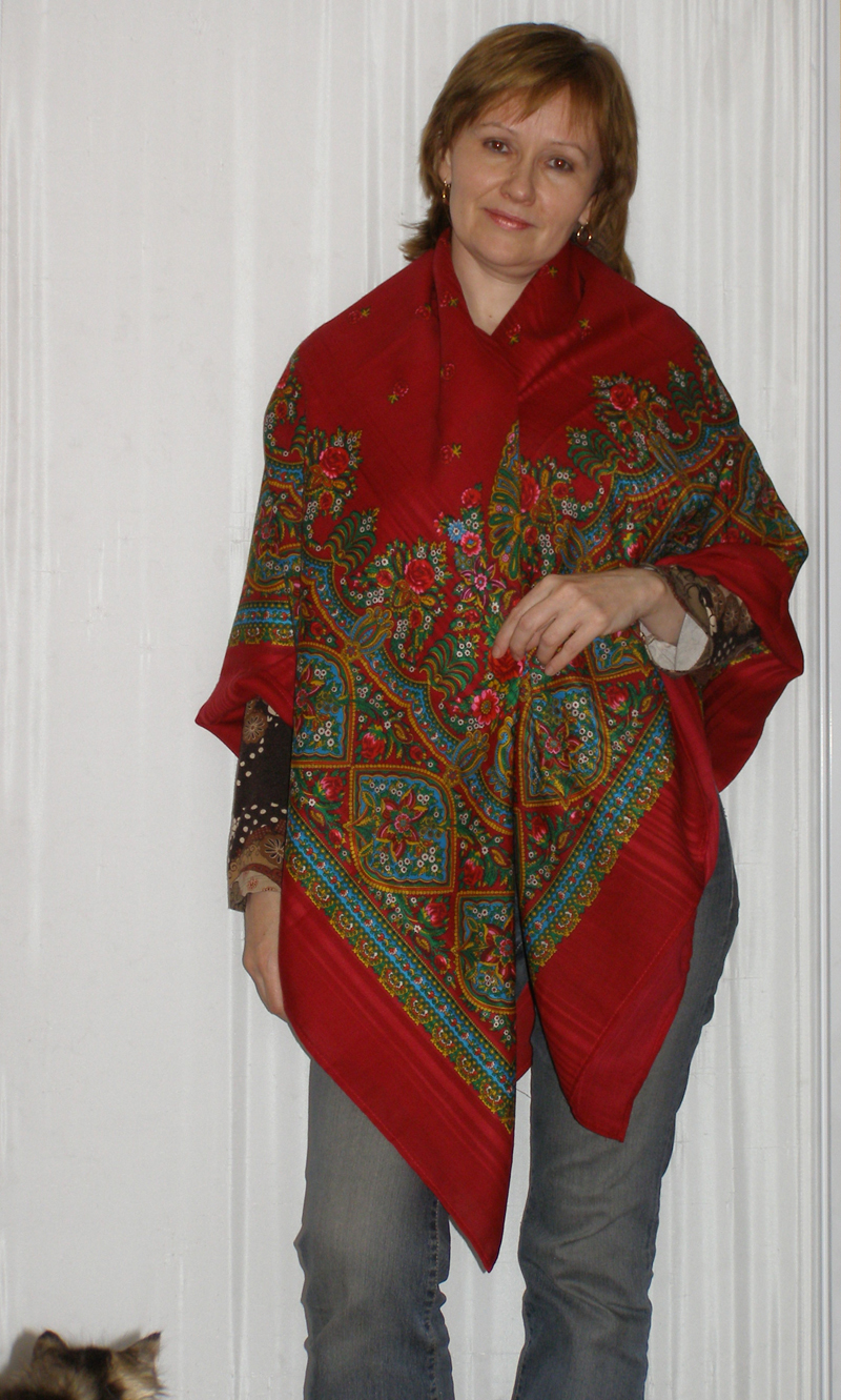 Ника,Вам замечательно идет все! У меня тоже "Отрада" с фиолетовыми цветами,как у Вас. Честно сказать,жалею,что приобрела. Уже кто-то писал,что фиолетовые цветы плохо смотрятся на столь тонкой ткани. Я еще раз посмотрела на свою шаль и убедилась. К сожалению, тогда на сайте не говорилось о том,что шаль тонкая. Зеленая "Отрада" или голубая смотрятся более удачно на тонкой шерсти.А из-за фиолетовых цветов,которые просвечивают,фон у моей "Отрады" кажется каким-то грязно-серым.С фиолетовыми цветами ткань должна быть плотной. Тогда цветы бы не смешивались с фоном.