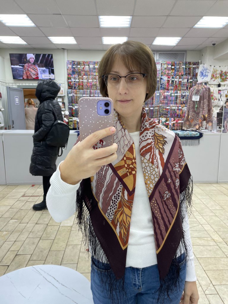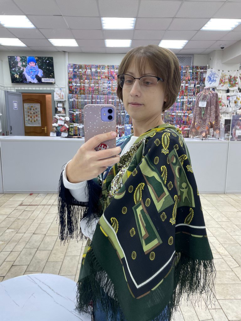 Абстракция. Два колорита. Зеленый и синий. Синий, к сожалению, в суматохе даже не посмотрела какой номер. Именно на нем разглядела силуэт человечка. Какое же интересное переплетение разных узоров, на каждом отвороте (повороте? волне? сборке?) платка есть чему зацепиться глазу.