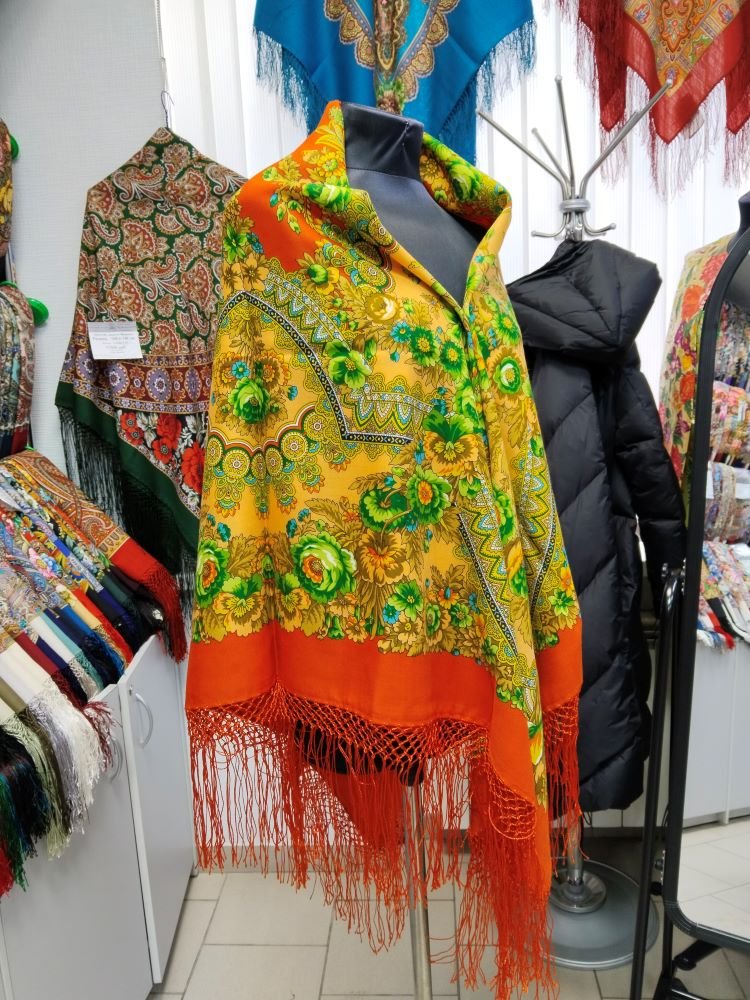 Тут вот манекен без одёжи, подставить можно мысленно вовнутрь любое, но по цвету верхние, как мне кажется получше, почестнее, тут немного больше желтого видят мои глаза, в жизни всё же оттенки оранжевого на шали.