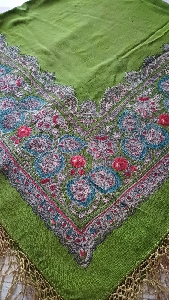 Купила на Мешке, по фото было непонятно, что за шаль, из какого материала. Решила, что довоенный хлопок. Ан нет. Шаль преподнесла сюрприз. Вот результаты тщательного осмотра: шаль ручной набойки на смесовой ткани (хлопок с вискозой), подгибка с закрытым срезом машинной строчкой по всему периметру. Бахрома вискозная, родная, в три клетки. Размер шали 150 см х141 см. На основании всего вышеперечисленного предполагаю датировку 1950-е гг., место производства - Павловский Посад.
