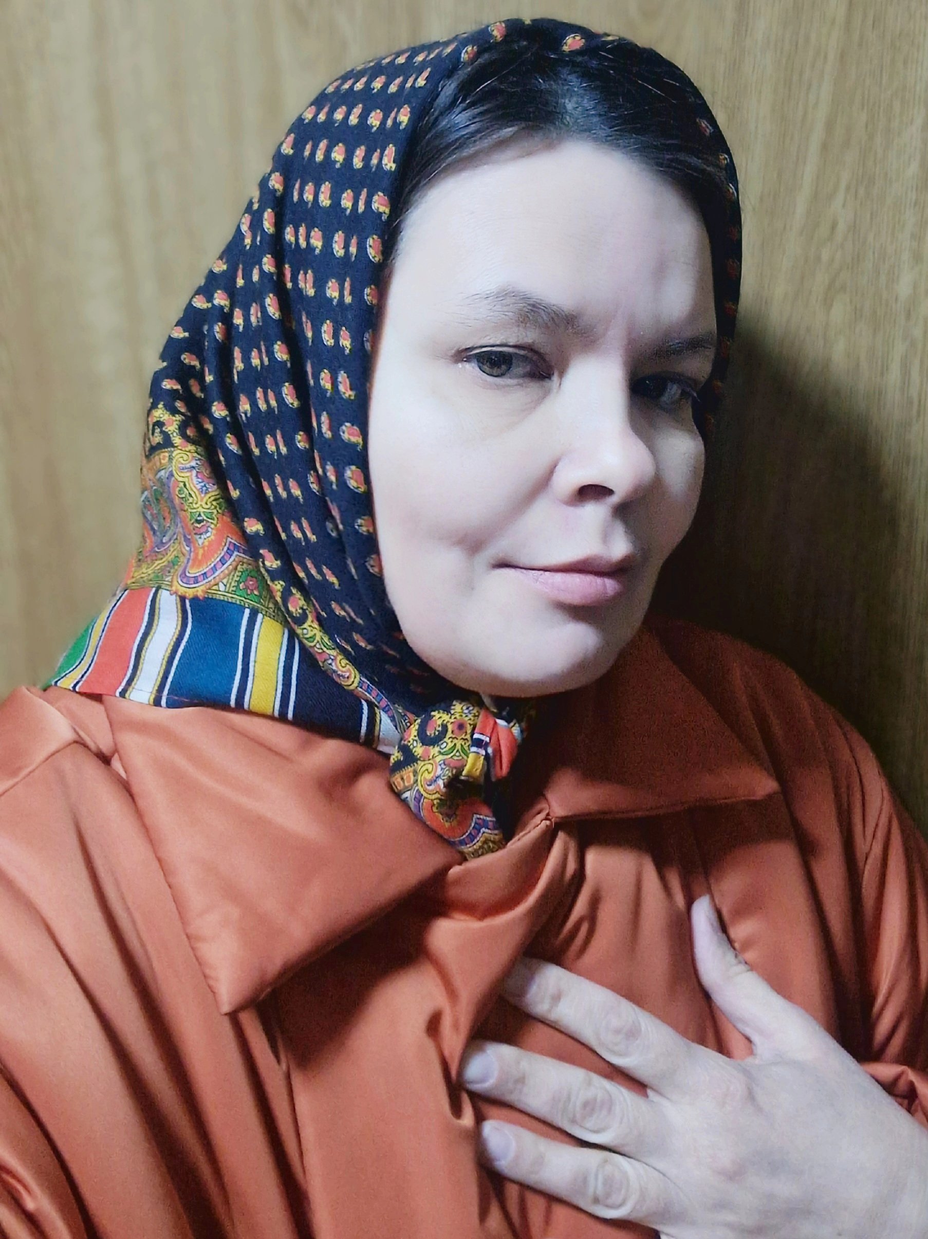 Ах, Марина, как хорошо И сочетание цветов красивое, и Вам очень идёт. Очень! Спасибо за показ! А я и внимание никогда не обращала на этот платок