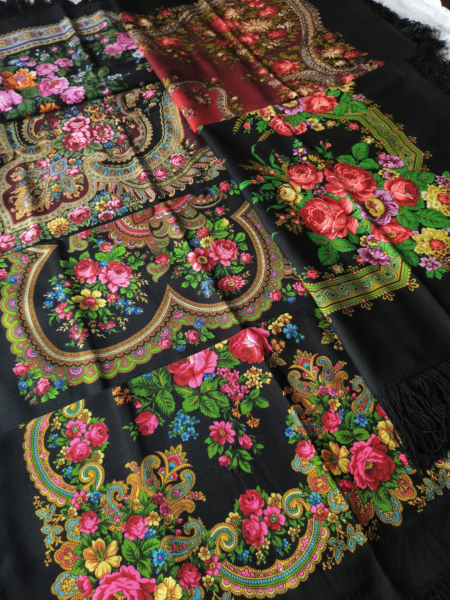 Когда этот платок появился на сайте, я была просто возмущена рисунком и особенно колоритом. Настолько он показался вычурным м дисгармоничным. Но увидев в магазине, просто остолбенела: потрясающий рисунок. Такие цветочки, такие листочки - нет слов. А колорит - сочетания оттенков красного, винного и розового, зеленого и бирюзы - просто фантастика!!