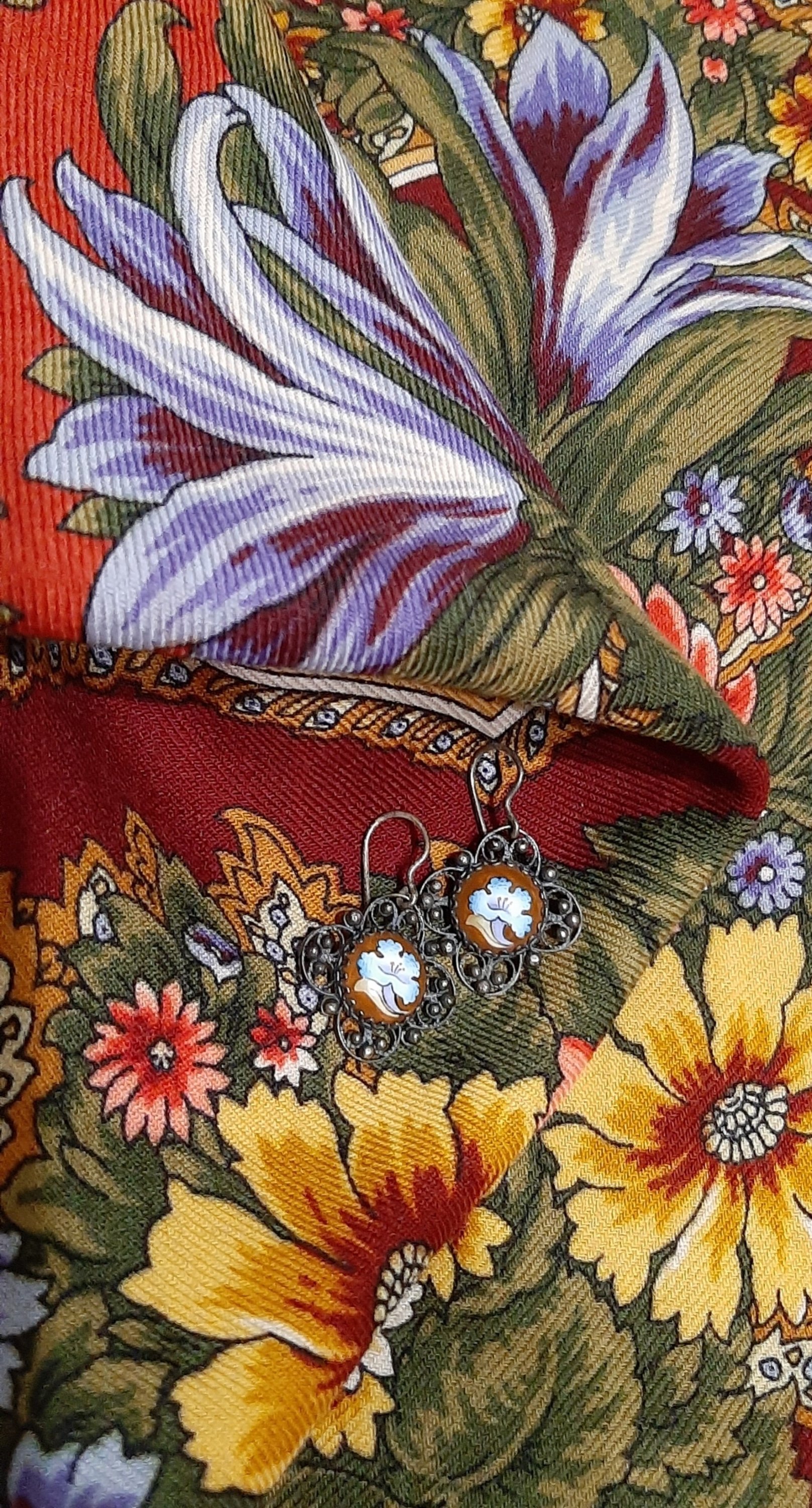 Эти Ваши фото с комплектами из финифти - самостоятельное полноценное произведения искусства и на редкость выразительные, имхо. Рисунок платка не спорит с рисунком украшений, а обнимает их. Хочется смотреть и смотреть ^%