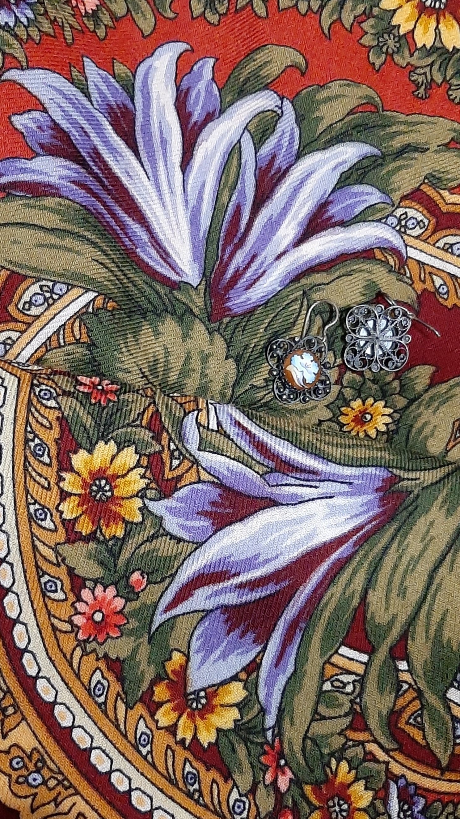 Эти Ваши фото с комплектами из финифти - самостоятельное полноценное произведения искусства и на редкость выразительные, имхо. Рисунок платка не спорит с рисунком украшений, а обнимает их. Хочется смотреть и смотреть
