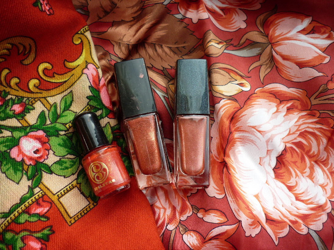 Мои любимые вот эти- Chanel 18 Rouge noir и OPI R60 (название серии не знаю). Вобще-то темный лак , так же как и "френч", ношу со всем подряд и к одежде не подбираю. Но раз уж тема про платки, то пусть будут вместе с шелковой шалью "Восточная сказка".