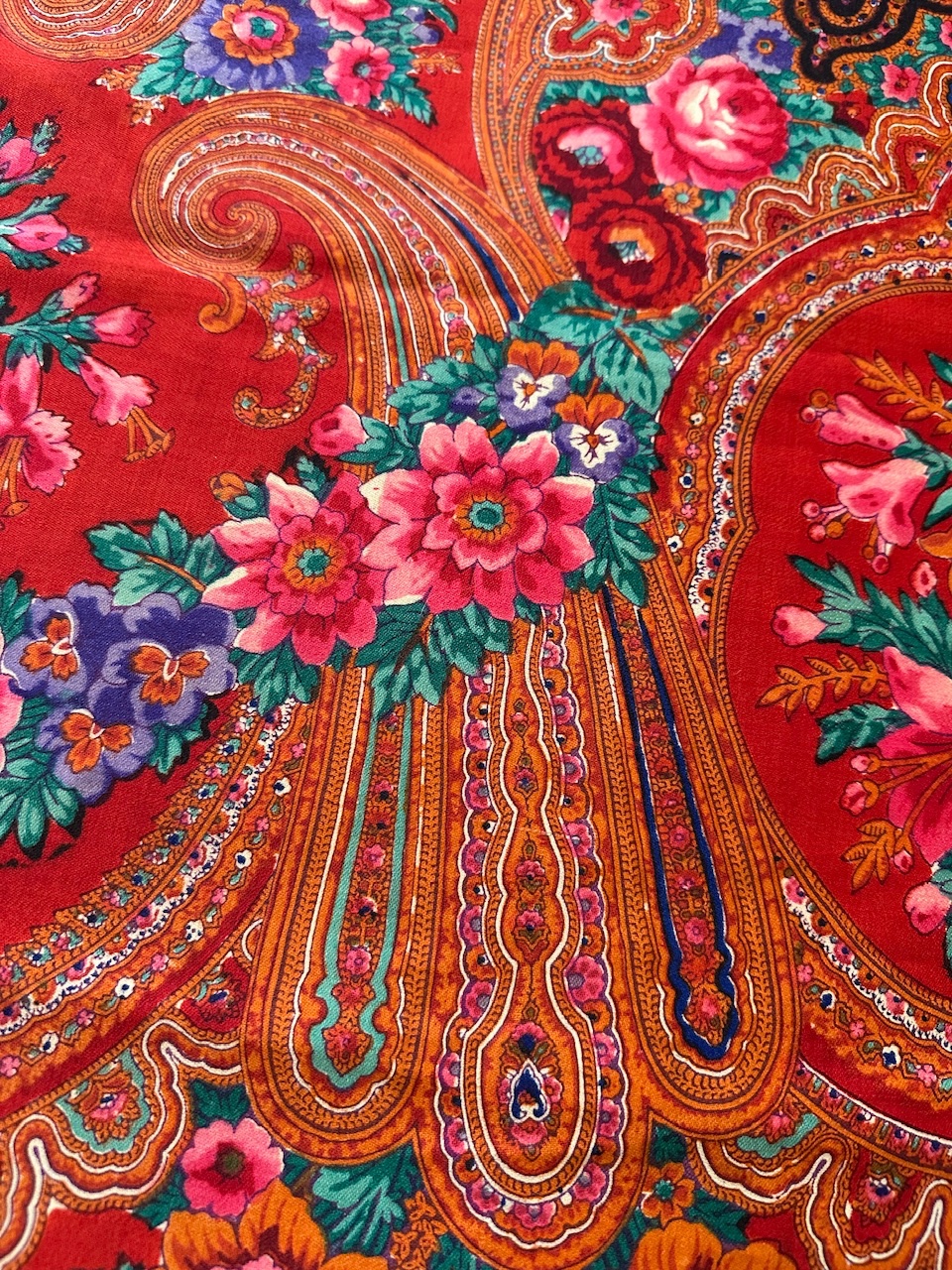 Старинная орнаментальная шаль конца XIX — начала ХХ в, тонкая шерсть саржевого плетения, ручная набойка, 160х166. Кистей нет. Следов от них нет. Клеймо отсутствует.