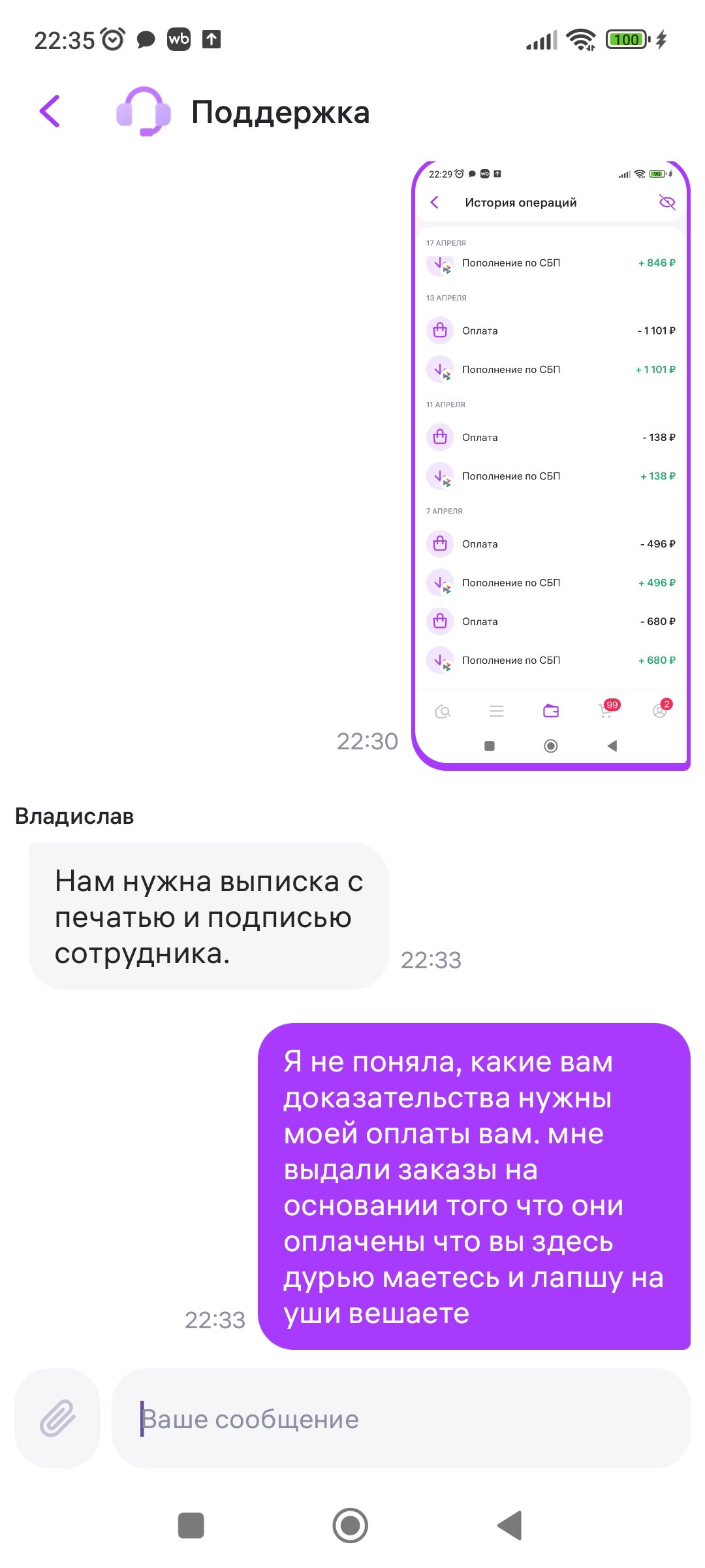 Ага, начали с 1 руб закончили 26 руб, потом больше накинут и доказывай, что ты не дурак?Флеринка писал(а): ↑25 апр 2025, 20:41Tsunlay, сочувствую, действительно аферисты какие-то. Что за странные доставки за 1 и 26 рублей, бред какой-то! И выписка - вообще и сверхнаглость, и тоже бред. Какой банк они имеют в виду? Если свой Вайлдберриз банк, то где взять офис с подписью и печатью сотрудника? Причём аккаунт может быть вообще без счета в их банке, я не стала «улучшать» свой аккаунт. А на Кошелёк сбрасываю деньги с разных банков, что, со всех выписки собирать? И смысл, если речь идёт о каких-то доставках за 26 рублей?!