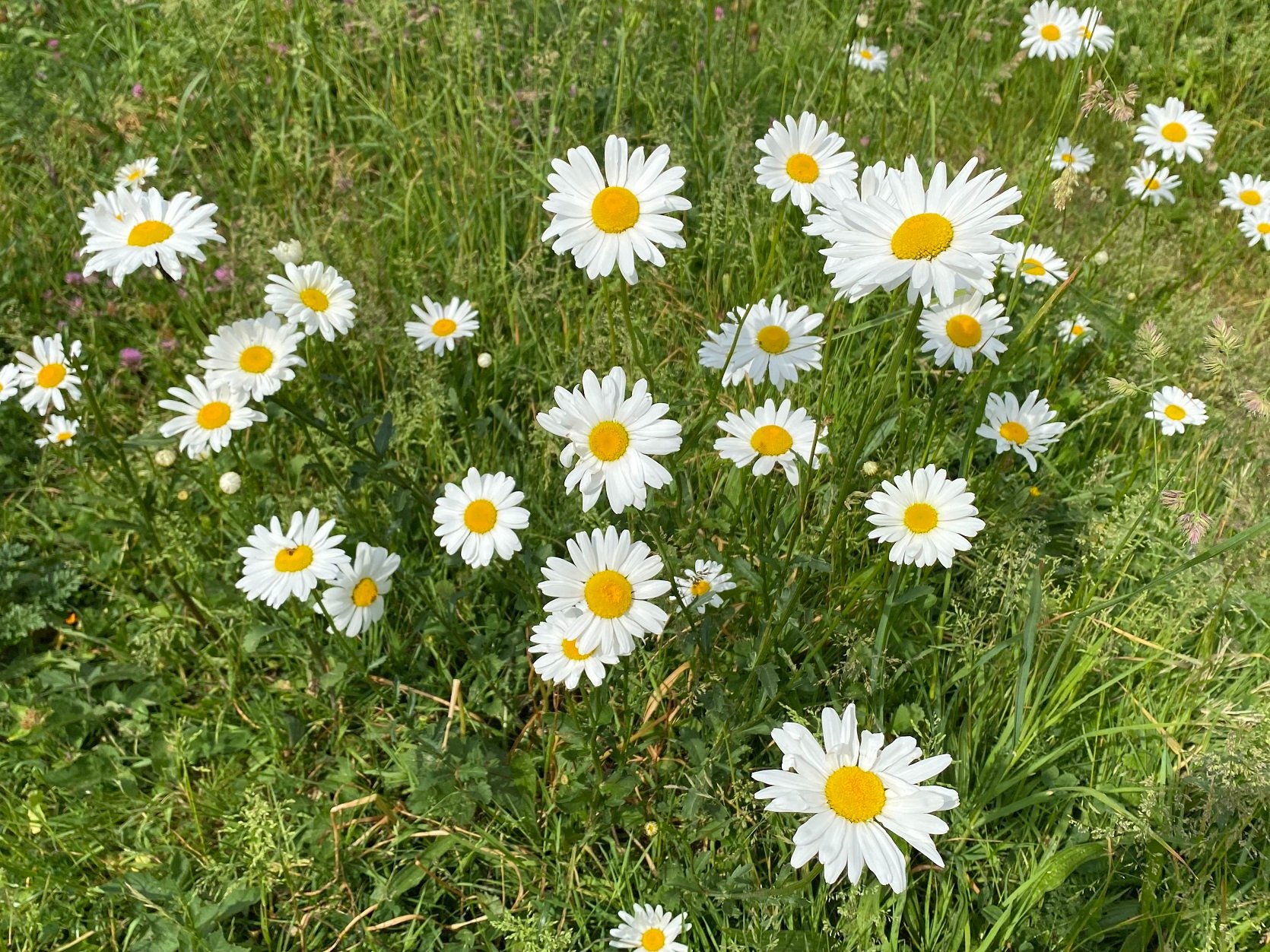 Вдоль улицы у дома тюльпаны и нарциссы сменились морем ромашек, клевера, лютиков и прочего лугового разноцветья.