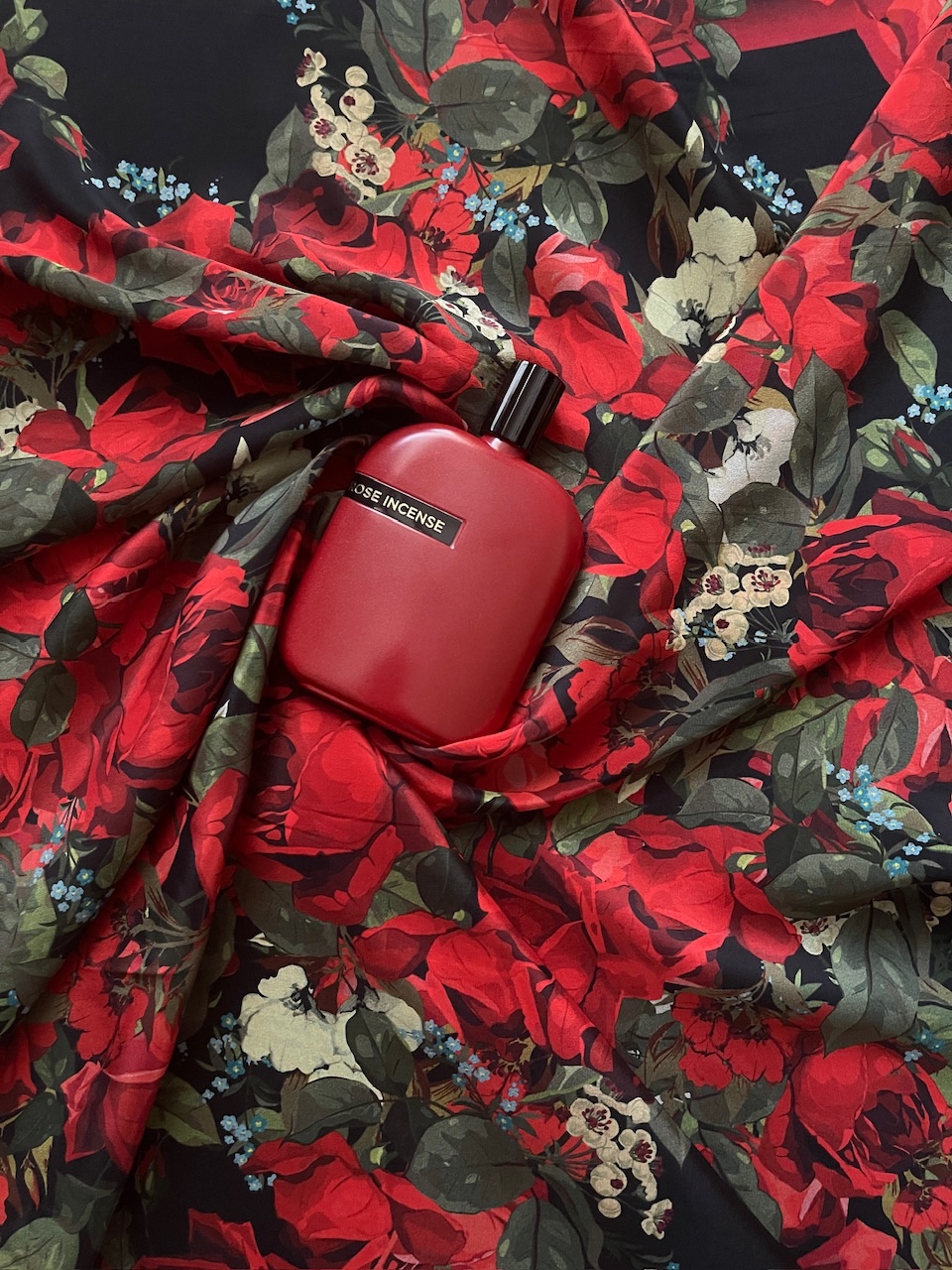 Крепдешиновый платок 10475-18 и аромат The Library Collection Rose Incense от Amouage. Роскошная бордовая роза в дымном ладане, смолы и чуточку чернил.