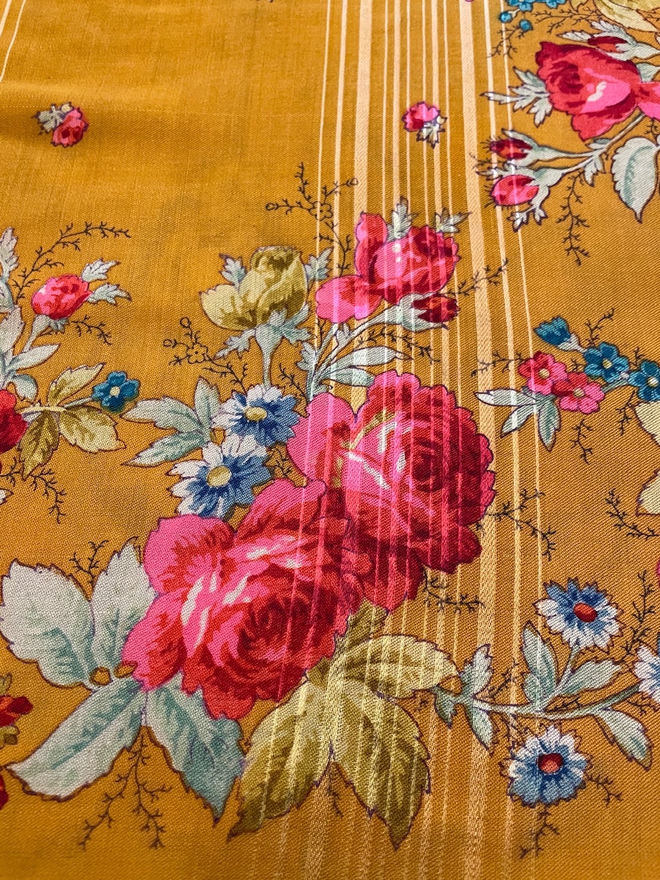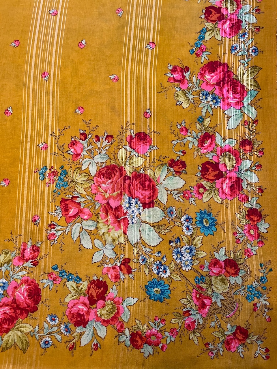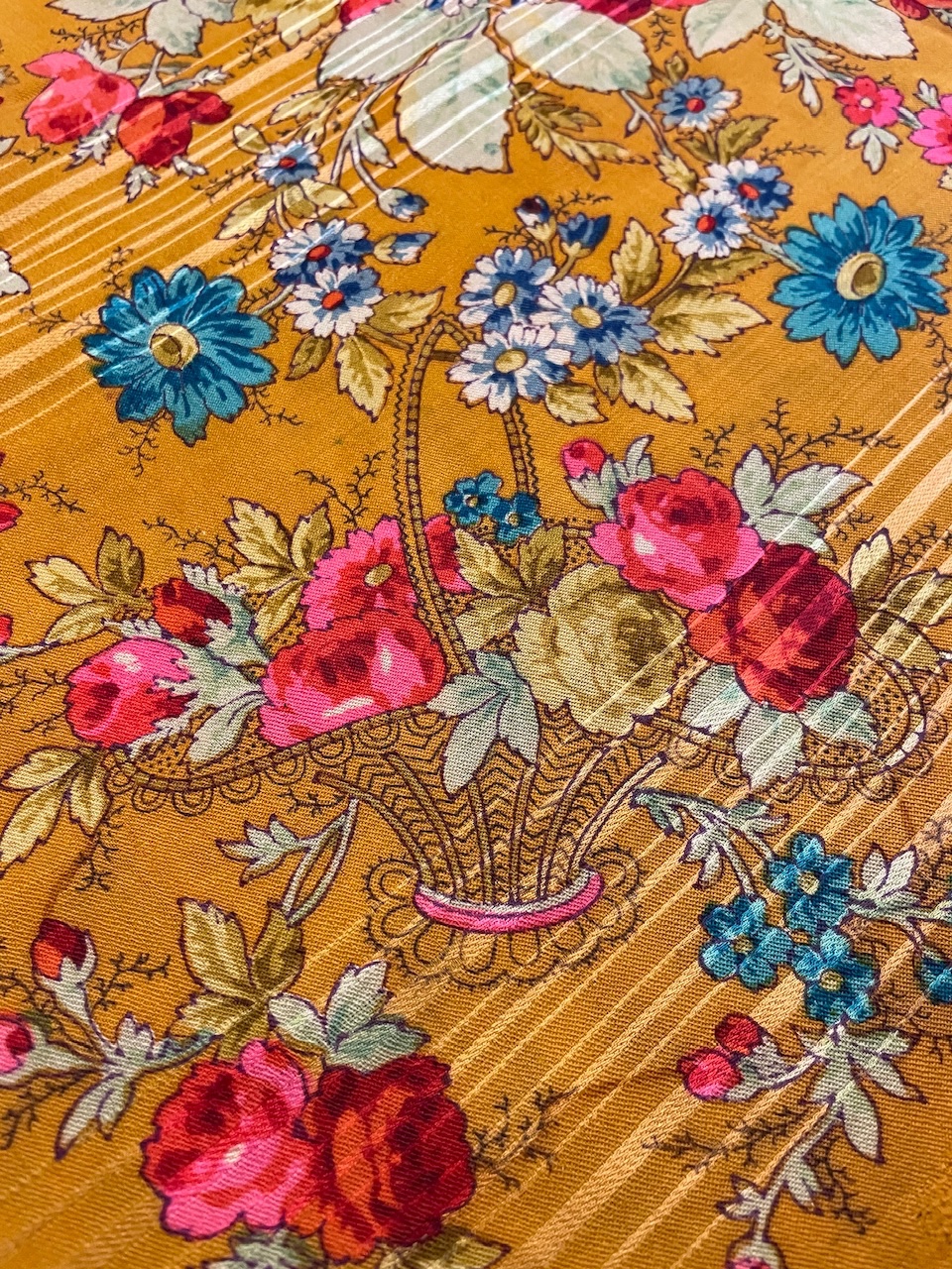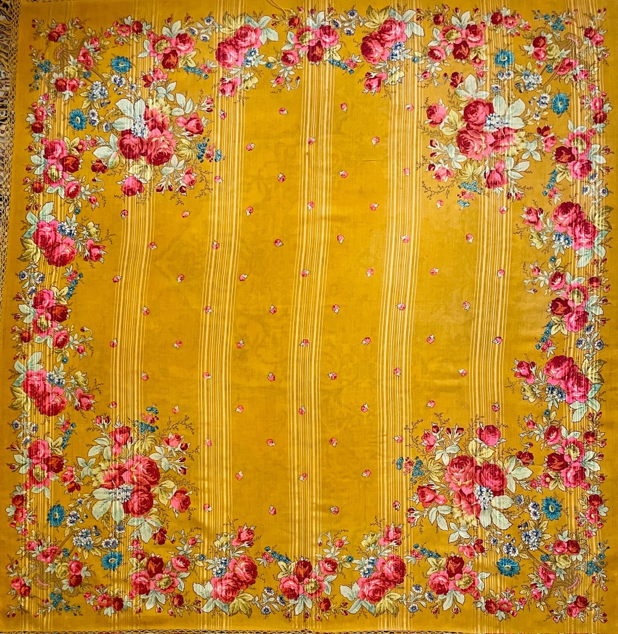 Шаль красивого шафранового оттенка на очень тонкой шерсти. В углах расположены двойные букеты, один из которых в корзинке. Букеты составлены из роз, пионов и мелких цветов. По периметру композиция связана повторяющимся более мелкими букетами из углов. Средник заполнен мелкими розочками.
