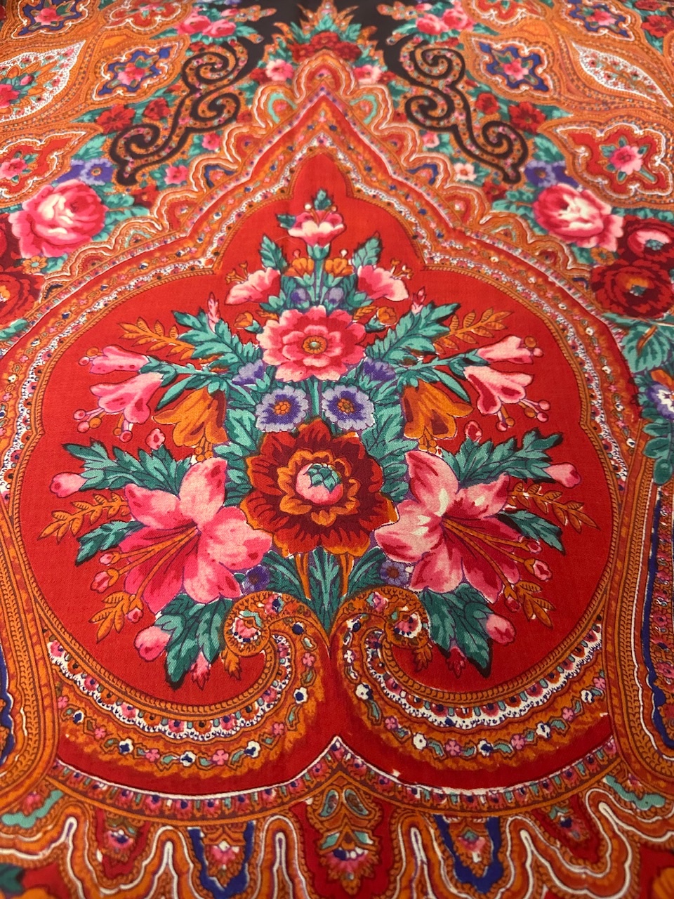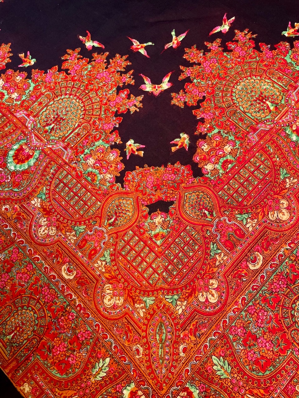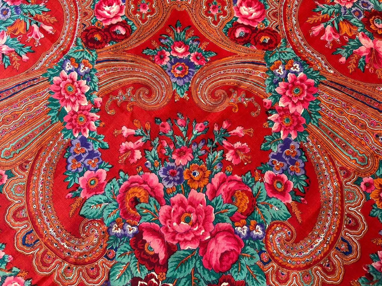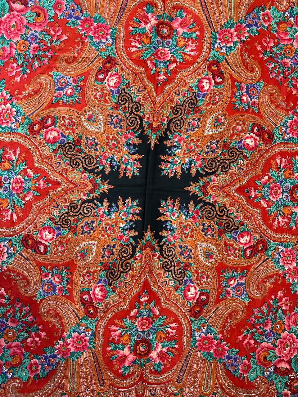 Старинная орнаментальная шаль конца XIX — начала ХХ в, тонкая шерсть саржевого плетения, ручная набойка, 160х166. Кистей нет. Следов от них нет. Клеймо отсутствует.