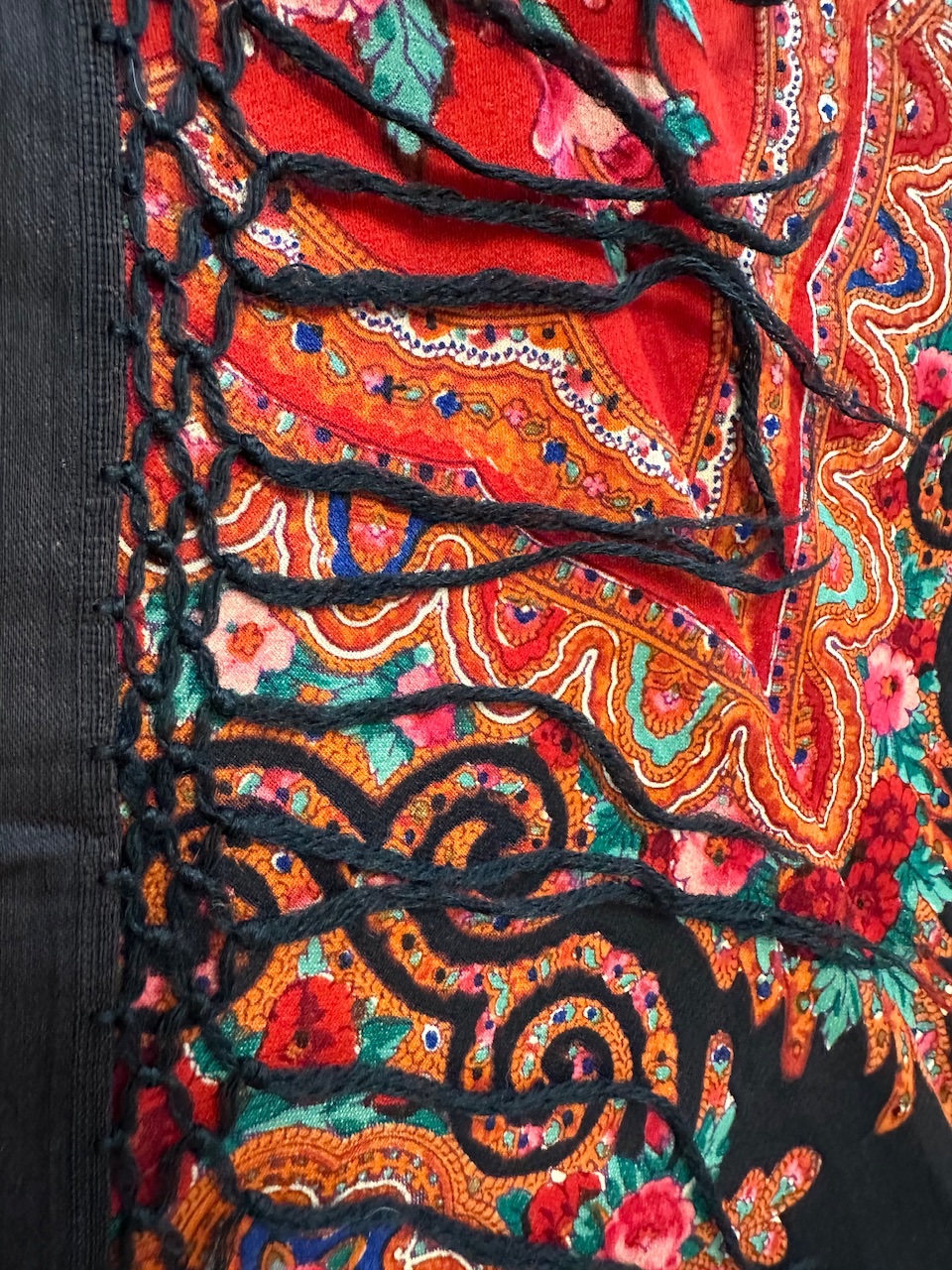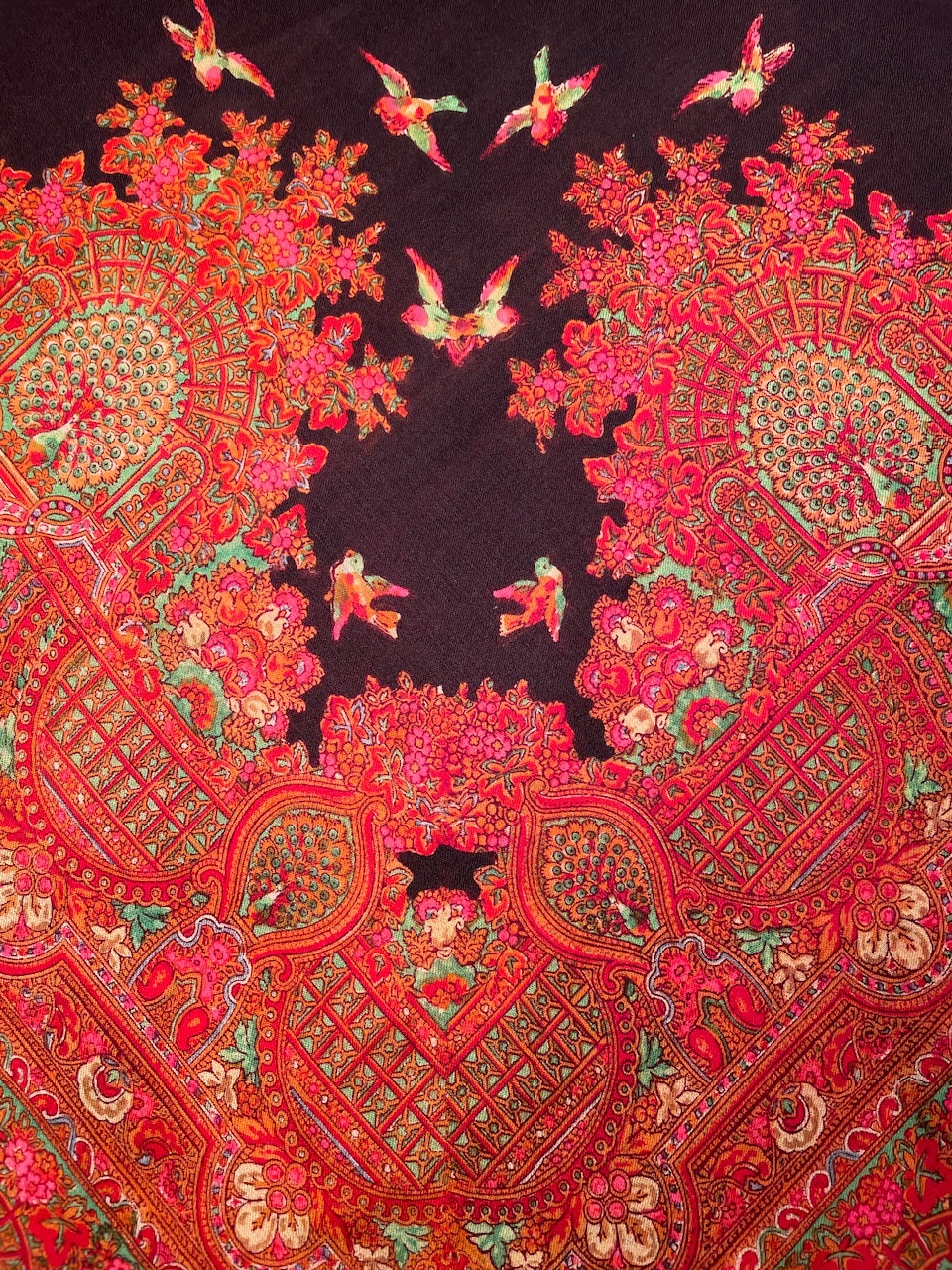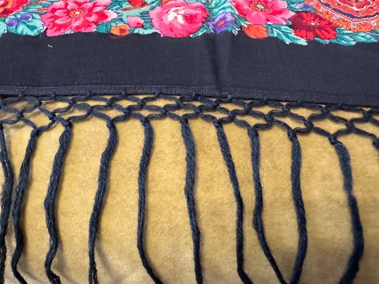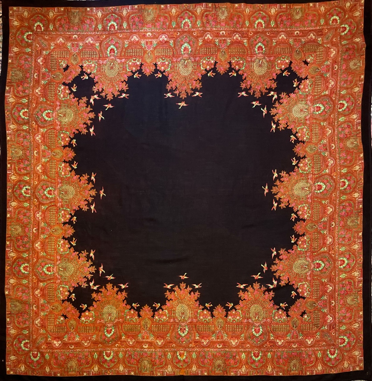 Старинная орнаментальная шаль конца XIX — начала ХХ в, тонкая шерсть саржевого плетения, ручная набойка, 160х166. Кистей нет. Следов от них нет. Клеймо отсутствует.